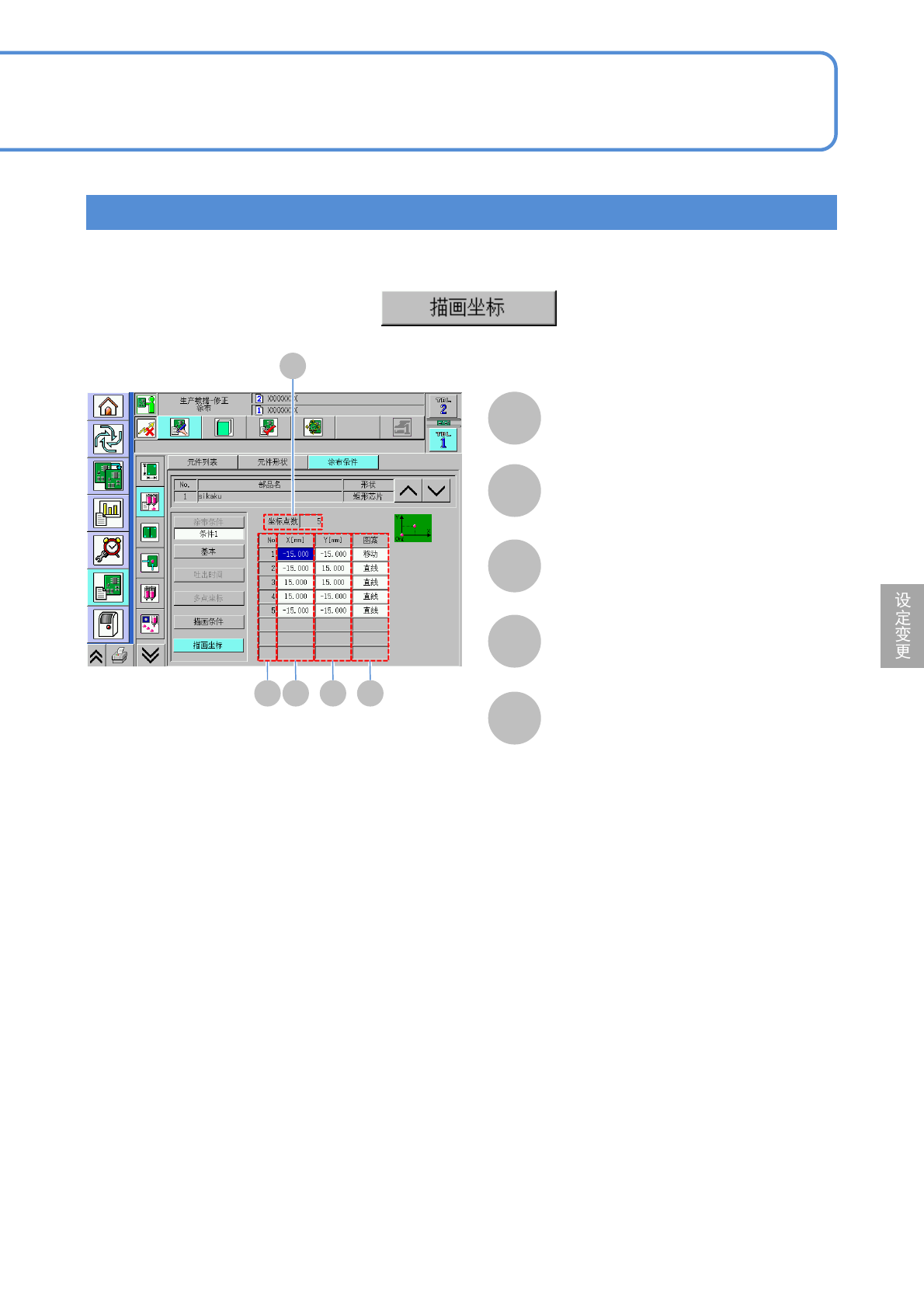 NPM-W 2 EJM7DC-MB-06O-06 6-1-15 -6 描绘坐标的设定 从「点胶条件」画面 (→P.6-1-15- 1 ) 只限有描绘数据时的情况 A B A 坐标点数 显示该元件列表的描绘坐标的点数。 B No 从 1 按顺序显示。 C X[mm] 显示点胶坐标 X 。 D Y[mm] 显示点胶坐标 Y 。 E 图案 显示该坐标数据的动作图案。 移动: 不进行点胶或者描绘的动作,只移动 XY 单元 直线: 进行从上一个坐…