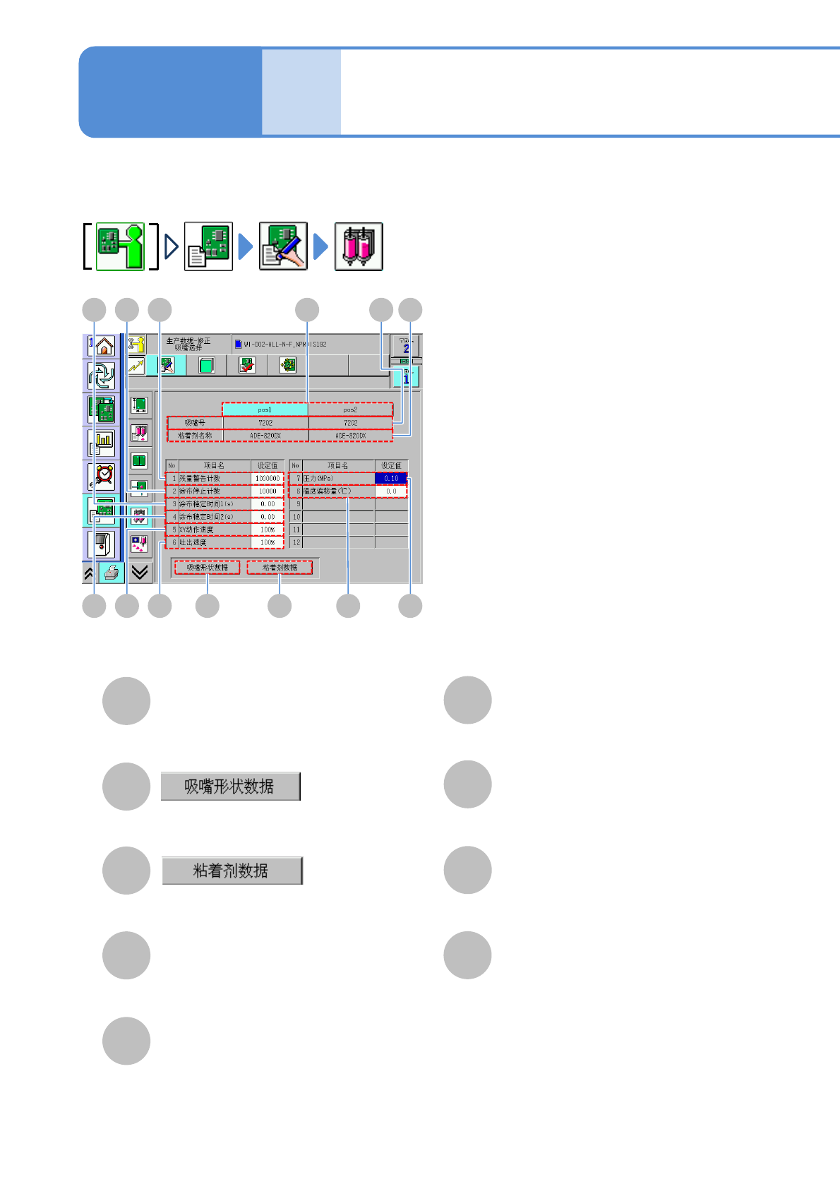 确认、修改各点胶头使用的吸嘴的控制参数信息。