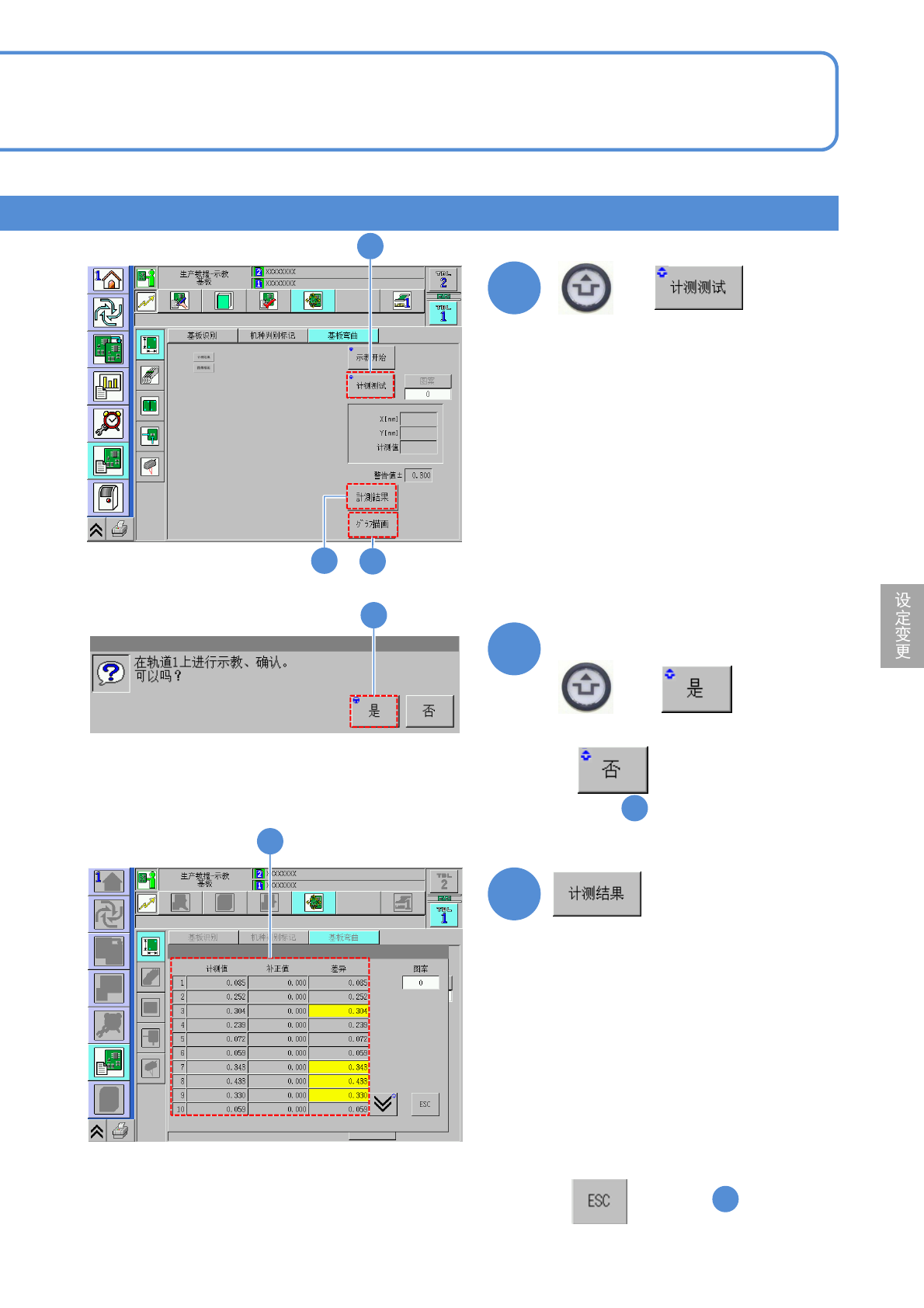 NPM-W 2 EJM7DC-MB-06O-06 + 6-2-3 -6 13 13 11 11 12 13 14 + ( 计测全部坐标,并显示计测结果。 ) 确认存在基板,以及提示 差异 :计测值和补正值的差 计测值:基板上面和计测基板上面的 理想差 当计测基板上面较高时,显示 正数) 补正值:通过计测结果所算出的补正 曲面的相同坐标值 ●当差异超出 0.3 mm 时,将显示错误, 背景转为黄色。 为了获得正确的补正曲面,重新确 认计测…