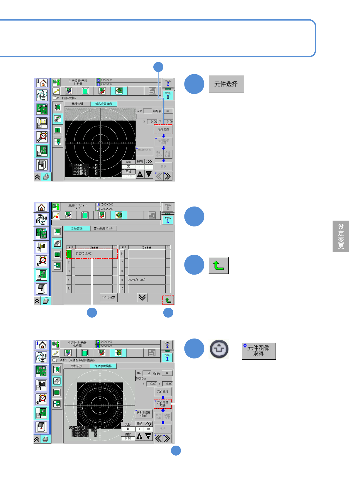 NPM-W 2 EJM7DC-MB-06O-0 6 6-2-6 -2 1 2 3 1 选择元件 ( 显示 < 选择元件 > 画面 ) 2 3 ●在 ADR 栏中显示绿色的项目,表示 需要 进行元件识别校正的元件 ( 返回到 < 元件吸着偏移 > 画面 ) 4 + ( 读取元件图像 ( 合成 )) 4