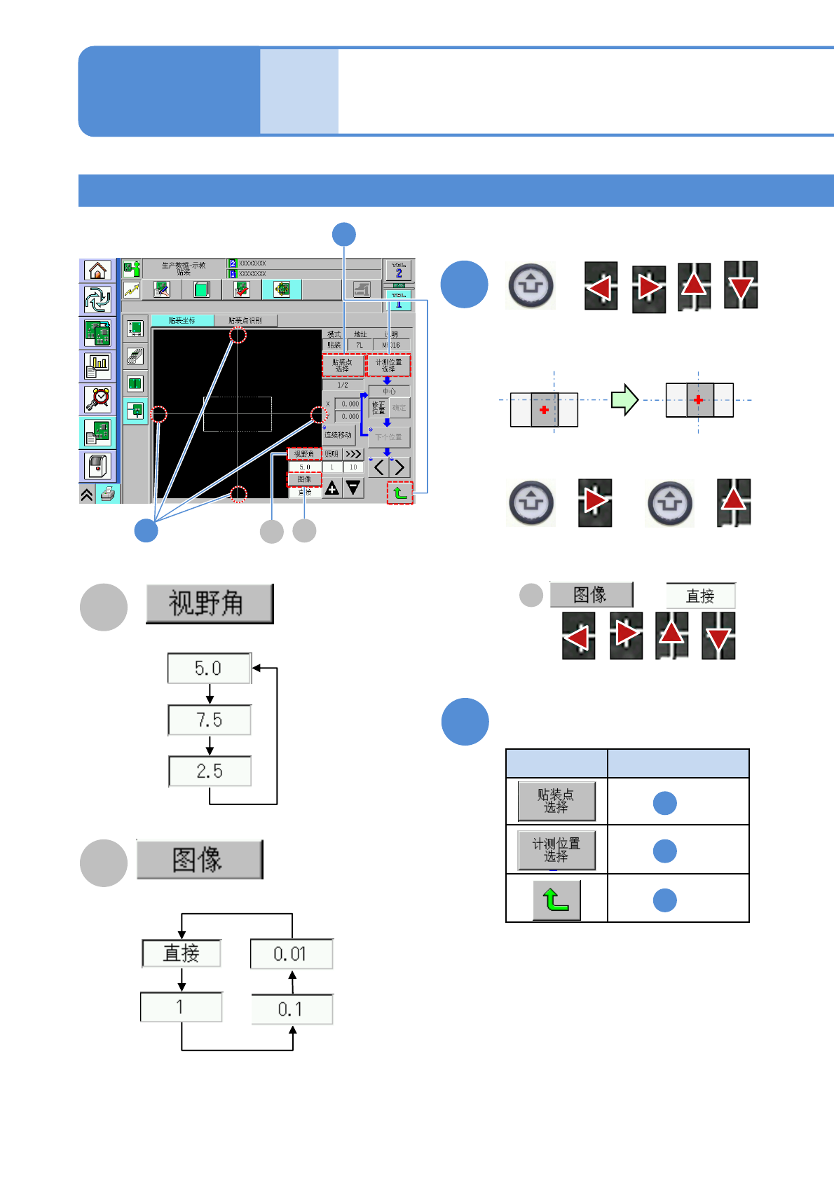 NPM-W 2 EJM7DC-MB-06O-0 6 生产数据 校正 贴装坐标校正 4 操作篇 6-2-9 6-2-9 -7 操作键种类 动作 5 返回 的画面 通过元件进行校正 ( 计测方法 : 1 点 )3 10 ■元件的中心偏位时 10 + ●元件中心和十字线中心保持一致。 上述例子使用以下 2 个方向。 ++ 11 11 按下表任一键 1 8 返回 的画面 返回 的画面 调整视野范围。 切换图像的移动量。 A B A B 当为 时…