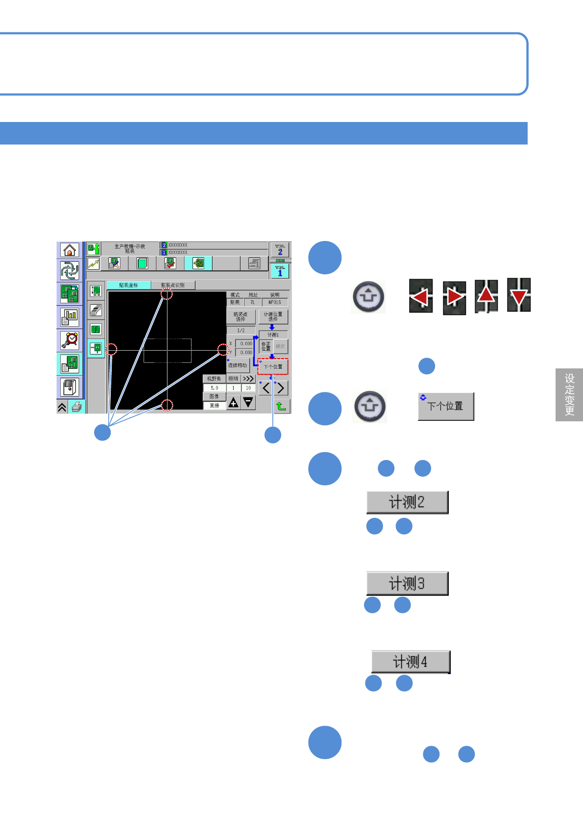 NPM-W 2 EJM7DC-MB-06O-0 6 生产数据 校正 贴装坐标校正 8 操作篇 6-2-9 6-2-9 -15 通过元件进行校正 ( 计测方法 : 4 点 ) 1 2 3 + 、 、 4 ■基板上有贴装元件时 ■基板上没有贴装元件时 5 7 至 至 、 5 + ●使十字线对准元件的「上端」。 使十字线对准元件端面 ●参阅「通过元件进行校正 ( 计测方法 : 2 点 ) 」的顺序 。 6 5 6 5 ● 都需要进行。 2 3…