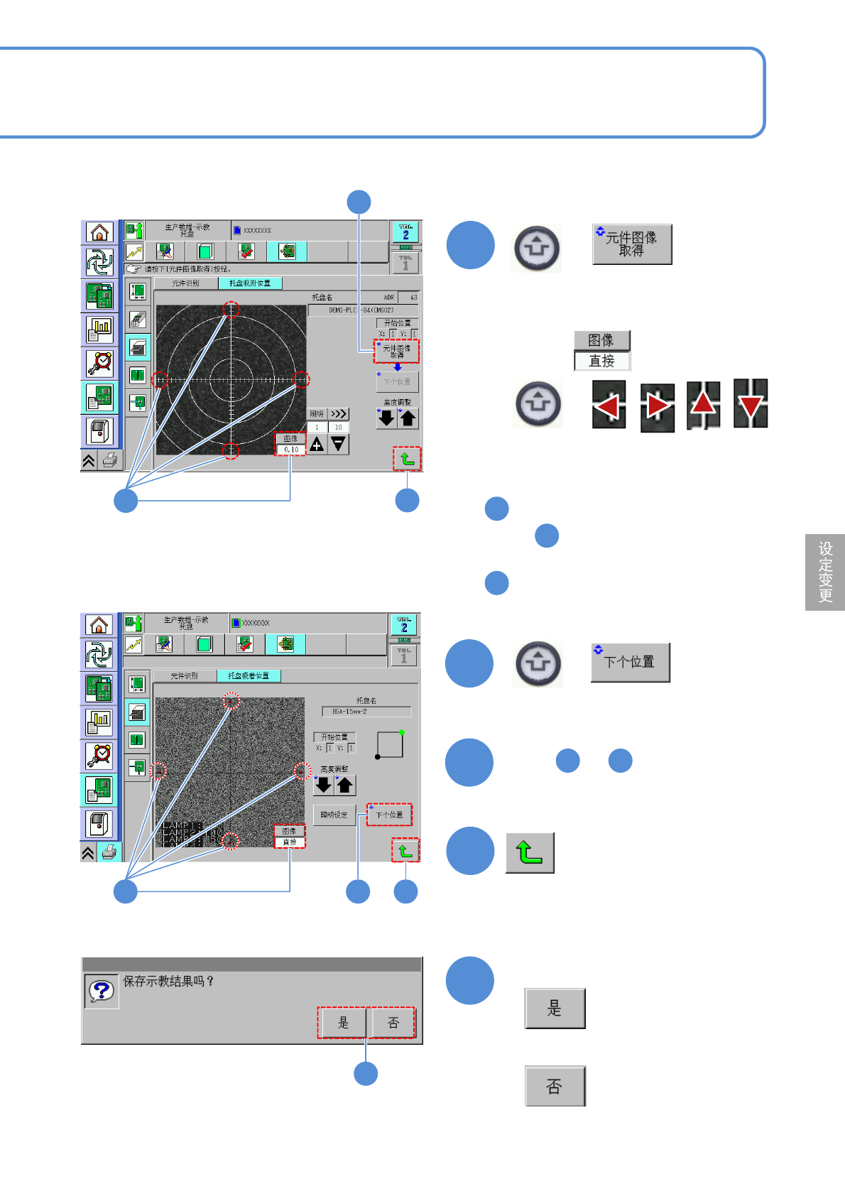 NPM-W 2 EJM7DC-MB-06O-06 生产数据 校正 6-2-1 1 -3 操作篇 6-2-1 1 托盘吸着位置校正 2 照相机看到的位置是吸着 位置。 4 4 5 + 5 用照相机校正 4 边的中心, 算出吸着位置。 用照相机校正 4 个角,算出 吸着位置。 用照相机校正对角 2 点,算 出吸位置。 ■ 1 点模式时 ■ 2 端模式时 ■ 4 角模式时 ■ 4 边模式时 ( 识别画面扩大显示,开始校正 ) 选择模式。 校正…