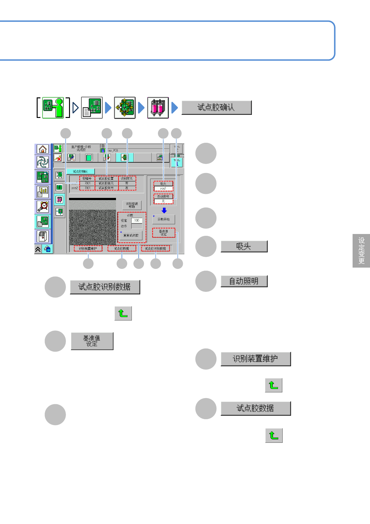 NPM-W 2 EJM7DC-MB-06O-06 生产数据 校正 6-2-14 -1 试点胶校正 1 ( 点胶头 ) 操作篇 6-2-14 输入试点胶数据 输入试点胶识别数据 校正的开始 照明值的设定 设定区域 识别 数据保存 再次确认试点胶 选择自动照明设定时不需要 校正结束 生产停止中的试点胶确认 校正的流程 即使在开始自动运转后的生产中途,只要设备处于停止 ( 单一停止、循环停止、单一错误停 止 ) 的状态,即可进行试点胶校正…
