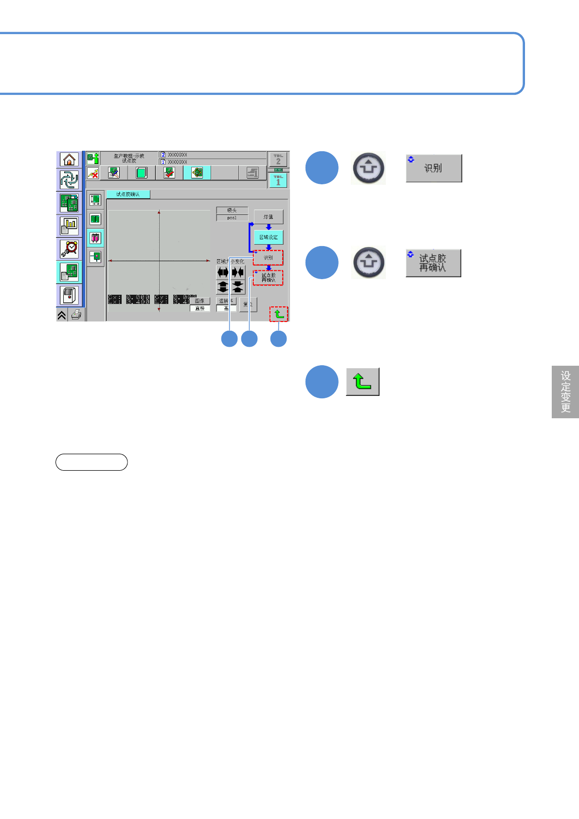 NPM-W 2 EJM7DC-MB-06O-06 生产数据 校正 6-2-14 -5 试点胶校正 3 ( 点胶头 ) 操作篇 6-2-14 A 8 9 基准面积值 (mm 2 ) 显示试点胶识别数据的「基准面积值 」的 数值。 ( 单位 : mm 2 ) 识别值: 显示从试点胶识别的结果取得的「总 面 积值」数值。 ( 识别结果不正常时,显示「 --- 」 ) 检测出图案数: 显示检测出的粘着剂图案数。 ( 识别结果不正常时,显示「 -…