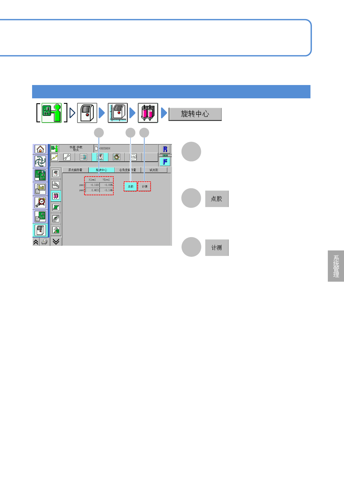 NPM-W 2 EJM7DC-MB-07O-07 7-3-5 -2 A B C 显示点胶头点胶时有关旋转中心的参 数。 旋转中心 X[mm]/Y[mm] 旋转中心的 XY 坐标。 显示有关计测各点胶嘴的旋转中心的 参数。 点胶头 B A C