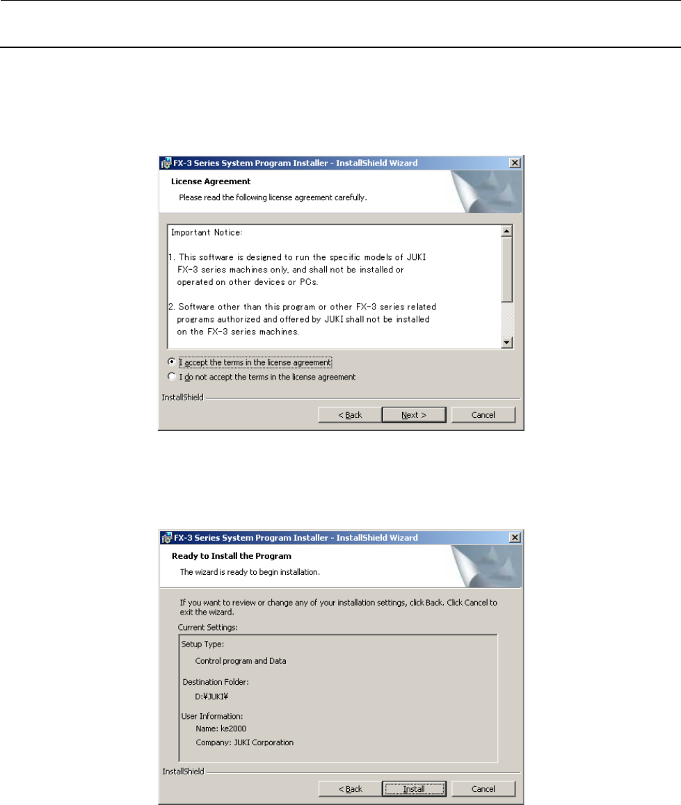 维修调整要领书 12 - 22 6 ) 显示关于使用许可协议的确认画面。 请对 [I accept the terms in the license ag reement] 加上勾选记号,点击 [Next] 按钮进到 7 )。(继 续前进时需要接受告知事项。) 7) 显示安装开始的确认画面。 请点击 [ Install ] 按钮向 8 )前进。