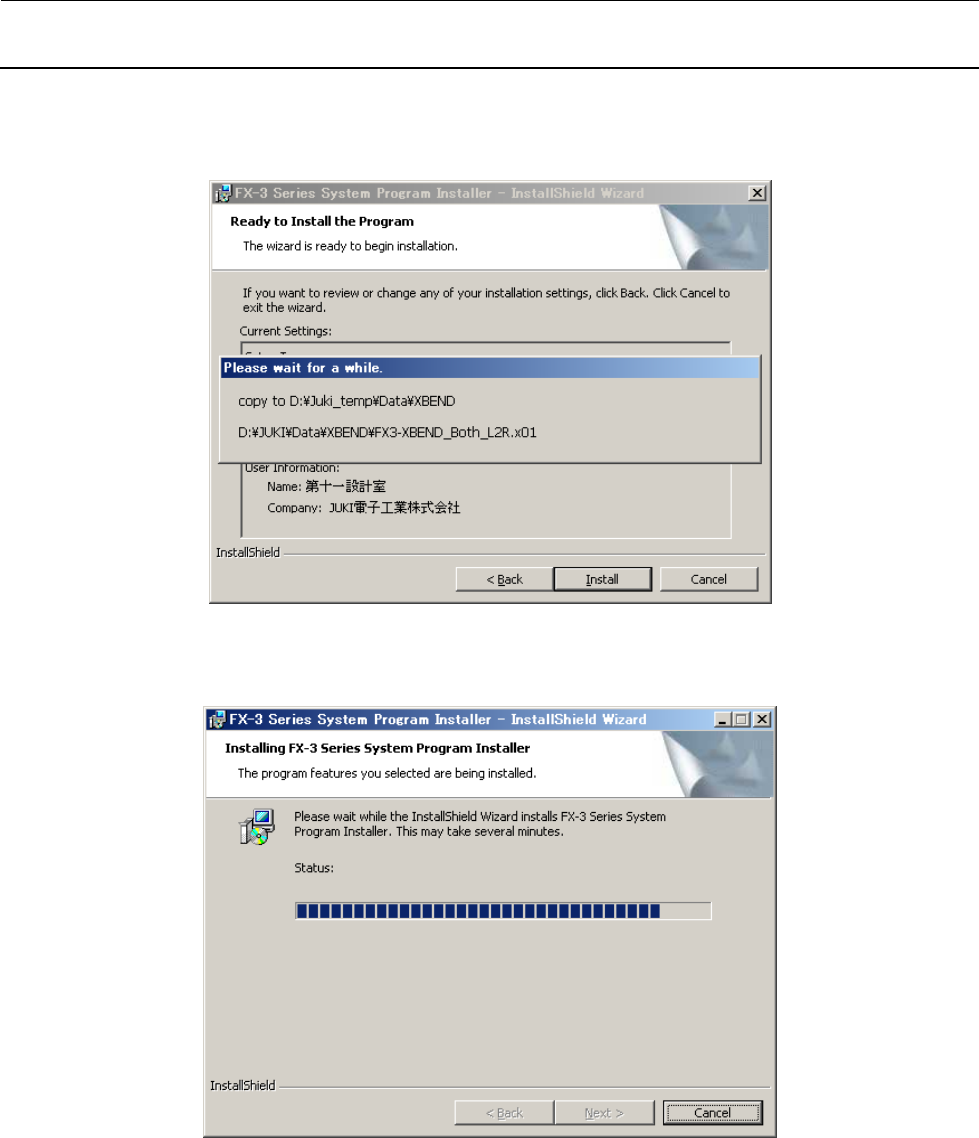维修调整要领书 12 - 36 9 ) 在第 8 )步原有软件的备份选择中选择了“ Yes ”时,会显示正在生成原有软件备份的画面。 10 ) 安装中间,进行状态以进度条显示。