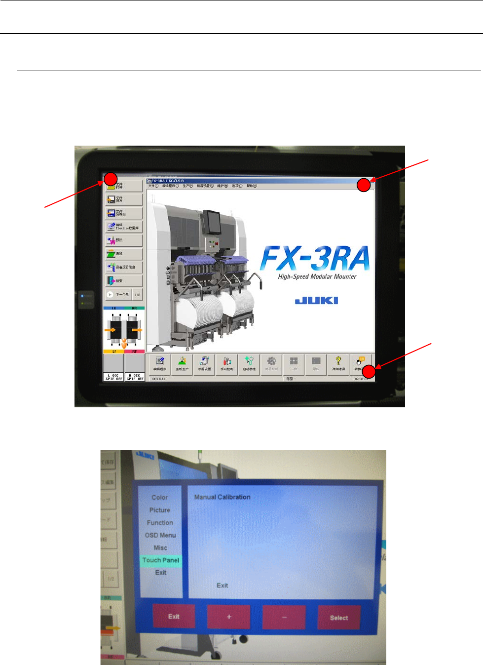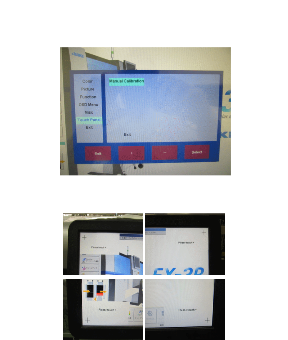 FX -3RA 维修调整要领书 12 -3 3 ) 接着操作 OSD 的“ Select ”,使光标移动至“ Manual Calibration ”。 4 ) 接着操作 OSD 的“ Select ”,画面左上方会显示“+”并开始校准。 画面左上方显示 “+” , 只要逐次点触中心部分, 即会按照右上方→左下方→右下方的順序显示 “+”,故每次都请点触“+”中心部分。
