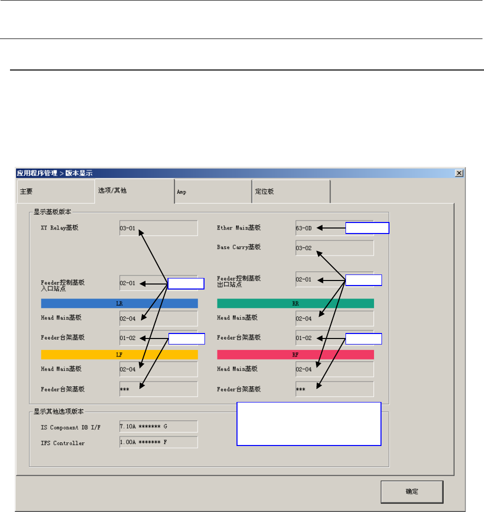 维修调整要领 书 A-2 2. 在贴片机本体上确认基板版本的方法 (FX - 3R /3RA 用 ) 打开 “主菜 单 ” /“ 帮助” /“ 关于程序… ”,选择 “ 选项 ・ 其他”的 选项卡。 会显 示各个基板的 电路图 形版本和功能版 本。显示时 的排列 每个基板不同。 ※ 画面上显示的版本与拨码开关之设定的排列 是不一样的,故须注意。 拨码开关的赋值要 检查 各个基板。 表示方法的解说 P : 基板图形 Re v. F : 基…