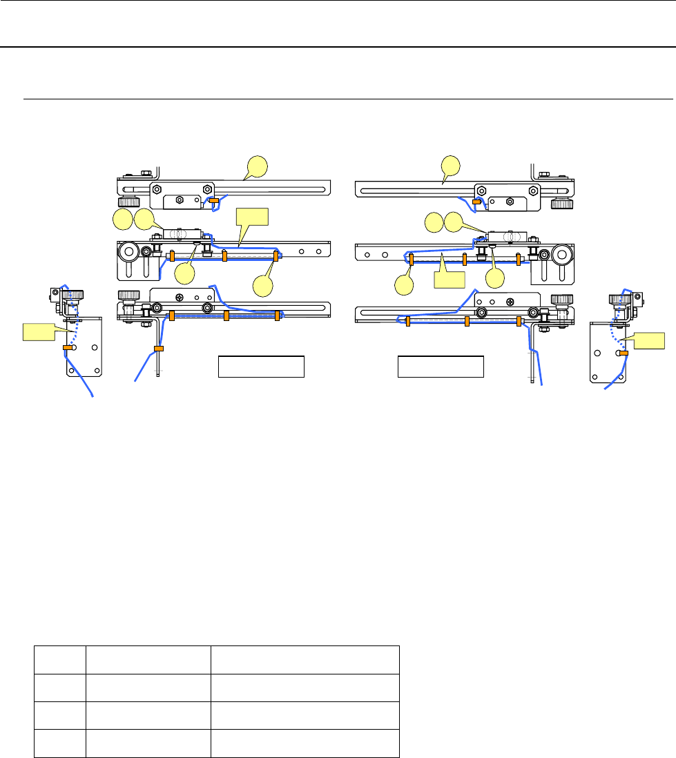 维修调整要领书 5-5 5-5 . WAIT/STOP/C - OUT 传感器的更换 图 5 -5- 1 各传感器配置(左→右流向) 5-5 -1 . 光纤部的更换 1 ) 从传送轨道上取下光纤。 2 ) 请放倒传感器放大器的光纤固定杆,抽出光纤。 3 ) 从WAIT传感器支架取下光纤。 4 ) 安装时,请按照3)→1)的顺序进行安装。 ※ 请将光 纤一 直插到 放大器 装置的内部。光纤的插入长度请以基准 标记为参照。 ※ 更换后请进行…