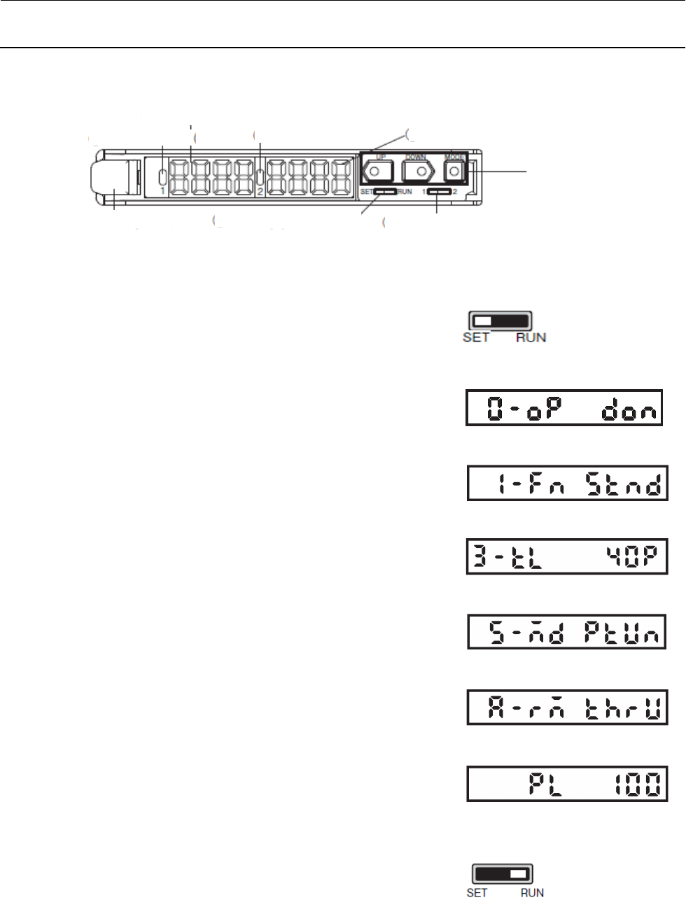 维修调整要领书 5-8 ◇属于 XL 规格时 图 5 -5- 3- 5 传感器放大器 XL 规格 <设置的操作> 1 ) 将⑤ SET /RUN 切换开关切换到“ SET ” 模式。 2 ) 按 ⑦操作键,转到动作模式的设置画面(显示“ 0- op ”), 按⑦的三角按钮,设置为暗态模式( don )。 3 ) 按⑦操作键,转到检测功能模式的设置画面( 1- Fn ),按⑦ 的三角按钮,设置为标准模式( Stnd )。 4 ) 按⑦操作…