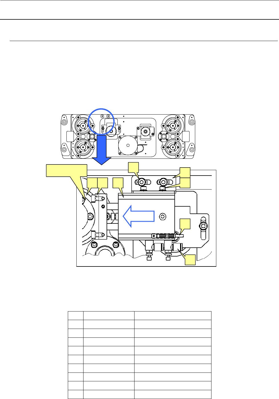 请松开④气缸定位螺丝,调整到①BU 止动器(橡皮部)的高度与滚珠螺杆连接缘外圆高度一致,