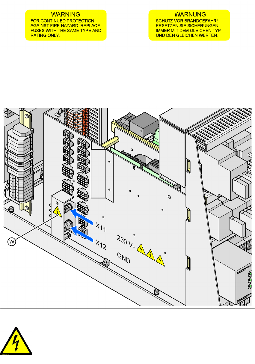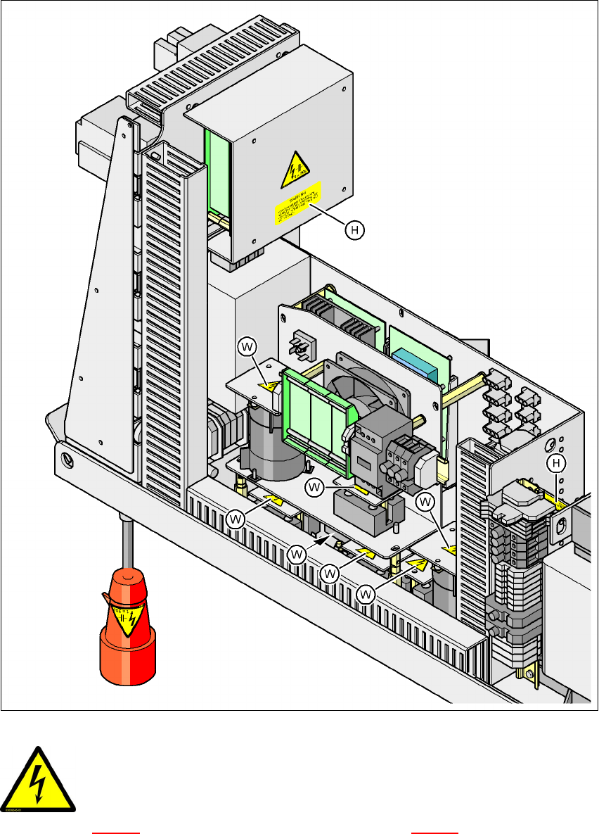 Fig. 2.2 - 10 Warning label W on the cover over the main power supply for the servo amplifier