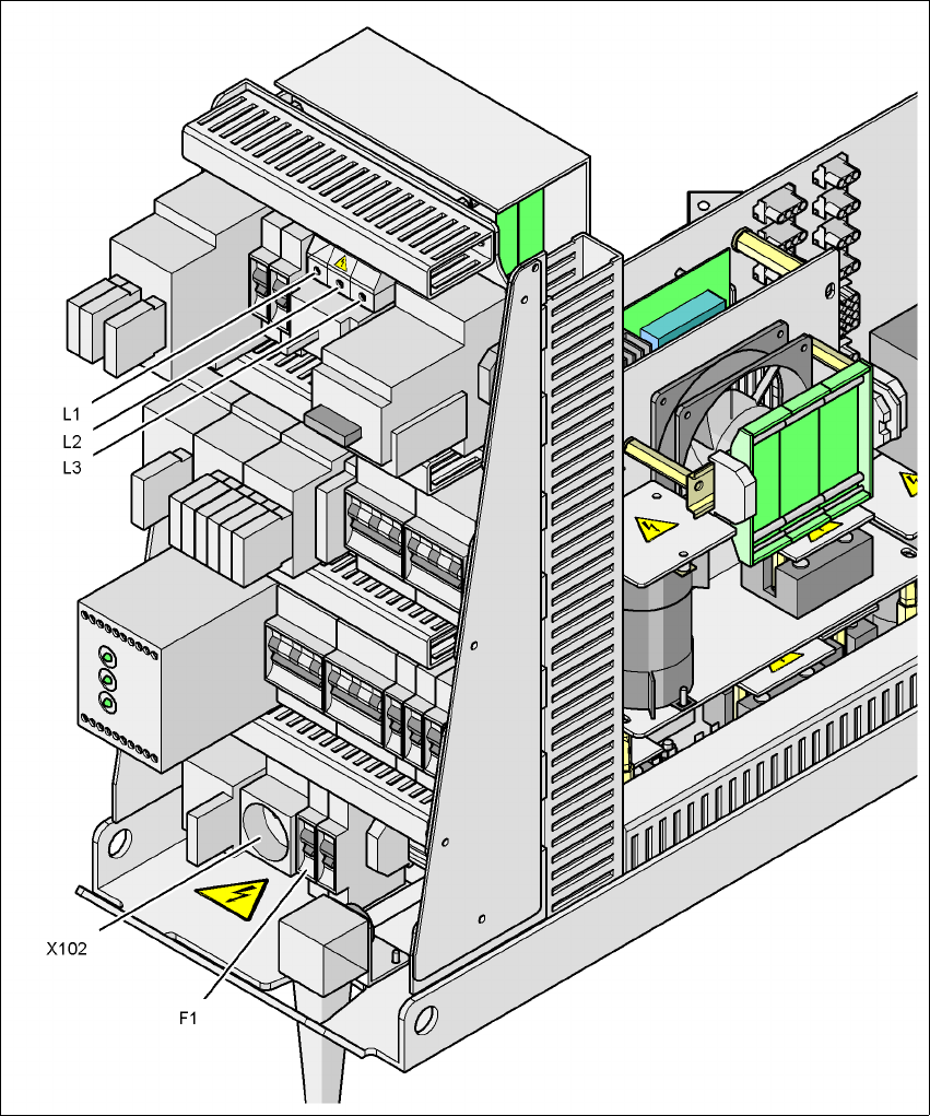– Cable connecting terminals L1, L2, and L3 in the main power switch Q1 (see Fig. 2.9 - 4