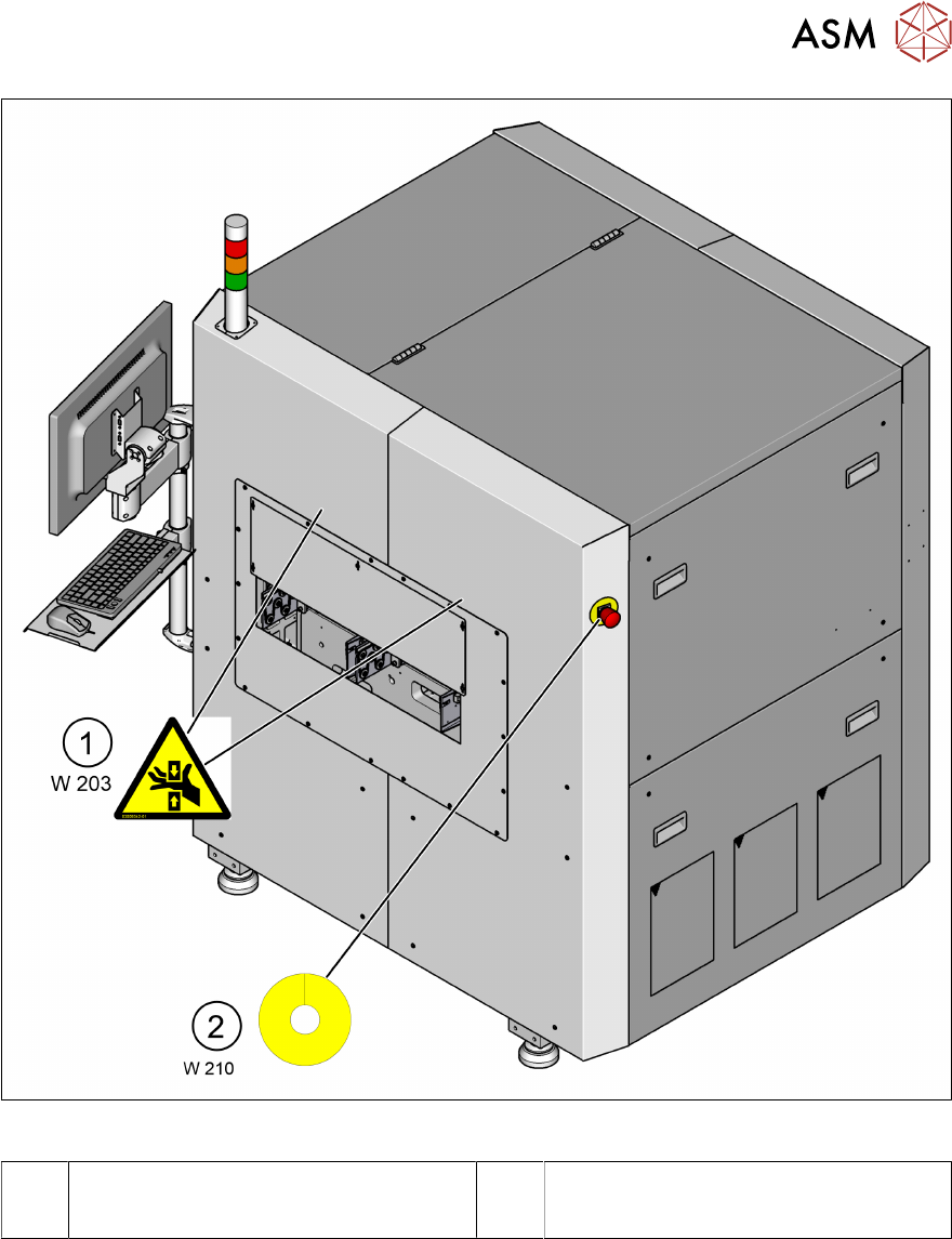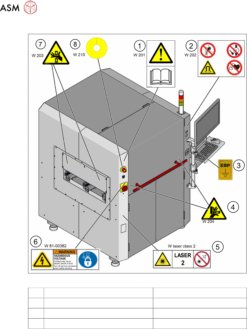 2 安全 2.2 警告标签 22 用户手册 ASM ProcessLens 03/2021 2.2.1 设备上的警告标签 图5: 警告标签正视图 1 W 201 [03009338-xx] 2 W 202 [03009341-xx] 3 外部接地点 [00359574-xx] 4 W 204 [03009343-xx] 5 W 二级激光 [03134118-xx] 6 W 81-00382 [03112319-xx] 7 W 203 …