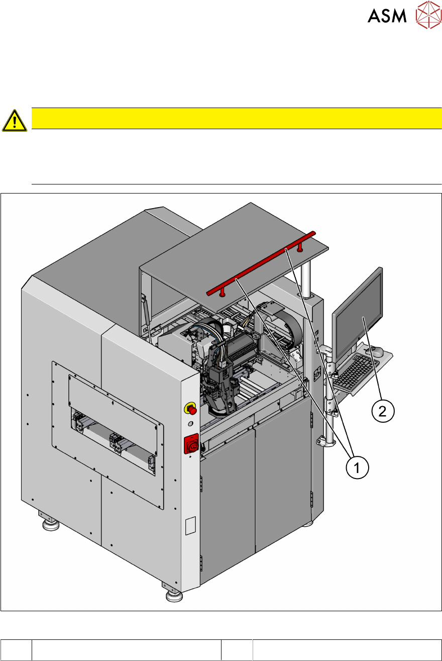 2 安全 2.4 操作设备时的安全须知 用户手册 ASM ProcessLens 03/2021 35 2.4 操作设备时的安全须知 2.4.1 关闭保护盖时的安全须知 注意 如果保护盖没有正确关闭,将有手部被压伤的危险。 操作人员应负责监督其人员关闭设备保护盖以免发生危险。 ► 关闭保护盖时应遵守以下说明。 图28: 关闭保护盖时的安全须知 1 握柄 2 显示器 ► 打开或关闭保护盖时,应始终通过握柄 (1) 握住保护盖。 ► 关闭…