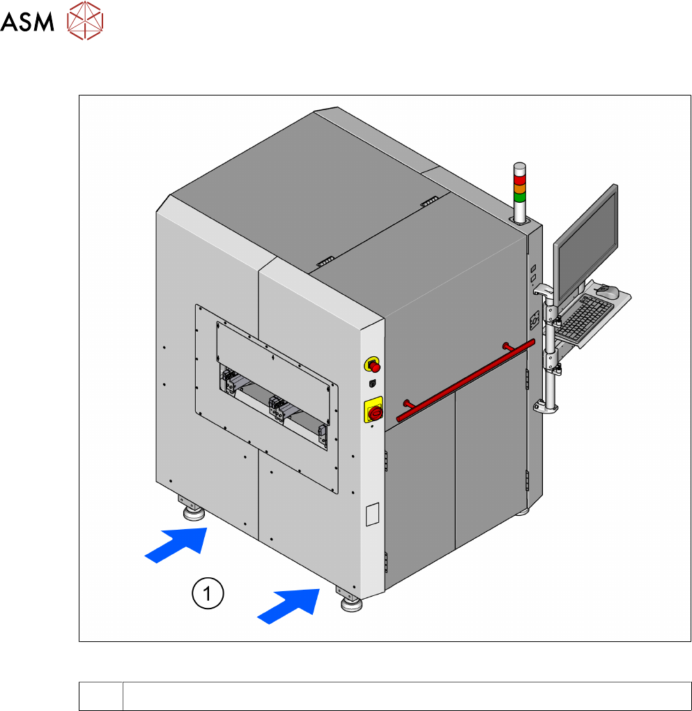 4 设置与调试 4.3 安装设备 70 用户手册 ASM ProcessLens 03/2021 4.3.2 使用叉车抬升和运输设备 图43: 接触表面 - 货叉与 PCB 传送方向平行 1 叉车货叉的接触表面 ► 让叉车与 PCB 传送导轨呈正确的角度并打开货叉,直到设备的接触表面均匀落在货叉上。