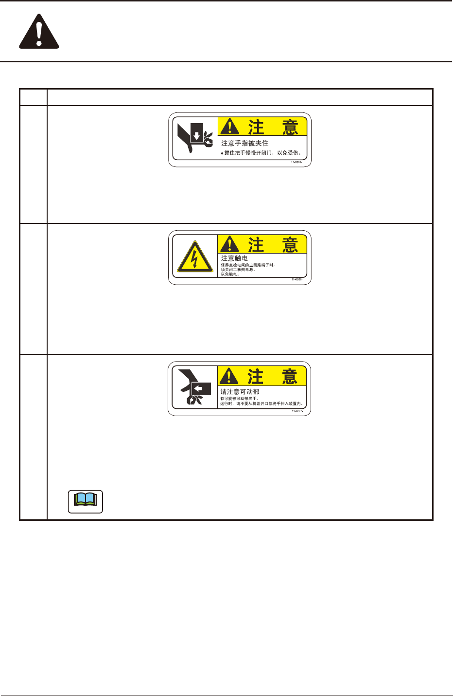 安全 -29 1OM-1732 1208-002 5. 本装置的警告标签 No. 警告标签及其说明 (10) 说 明 送料器安装台上下时,请不要将手伸入可动部。 送料器准备完了开关的 LED 灯闪烁时,送料器安装台进行升降,因此请小心。 (11) 说 明 本装置的 XY 横梁运行部使用强力的永久磁铁。 • 请不要使易带磁性的金属靠近。 有可能被磁性吸住而受伤或导致装置故障。 • 请不要使易受磁性影响的物品 ( 磁卡和钟表类 ) …