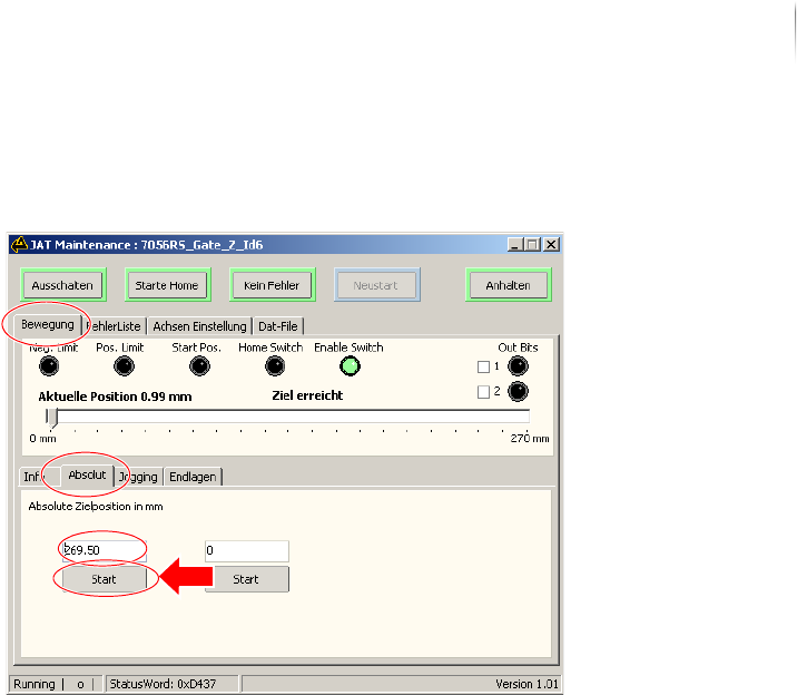 Installation First use 97 Inspection system X7056 | Operating manual | Version 3.1 Rev.006| 2016-01-06 | 30.009.1930a 11. Enter the value from si_trans.c onf in mm in JA T MAINTENANCE T oo l in the tab Movem ent - Absol …