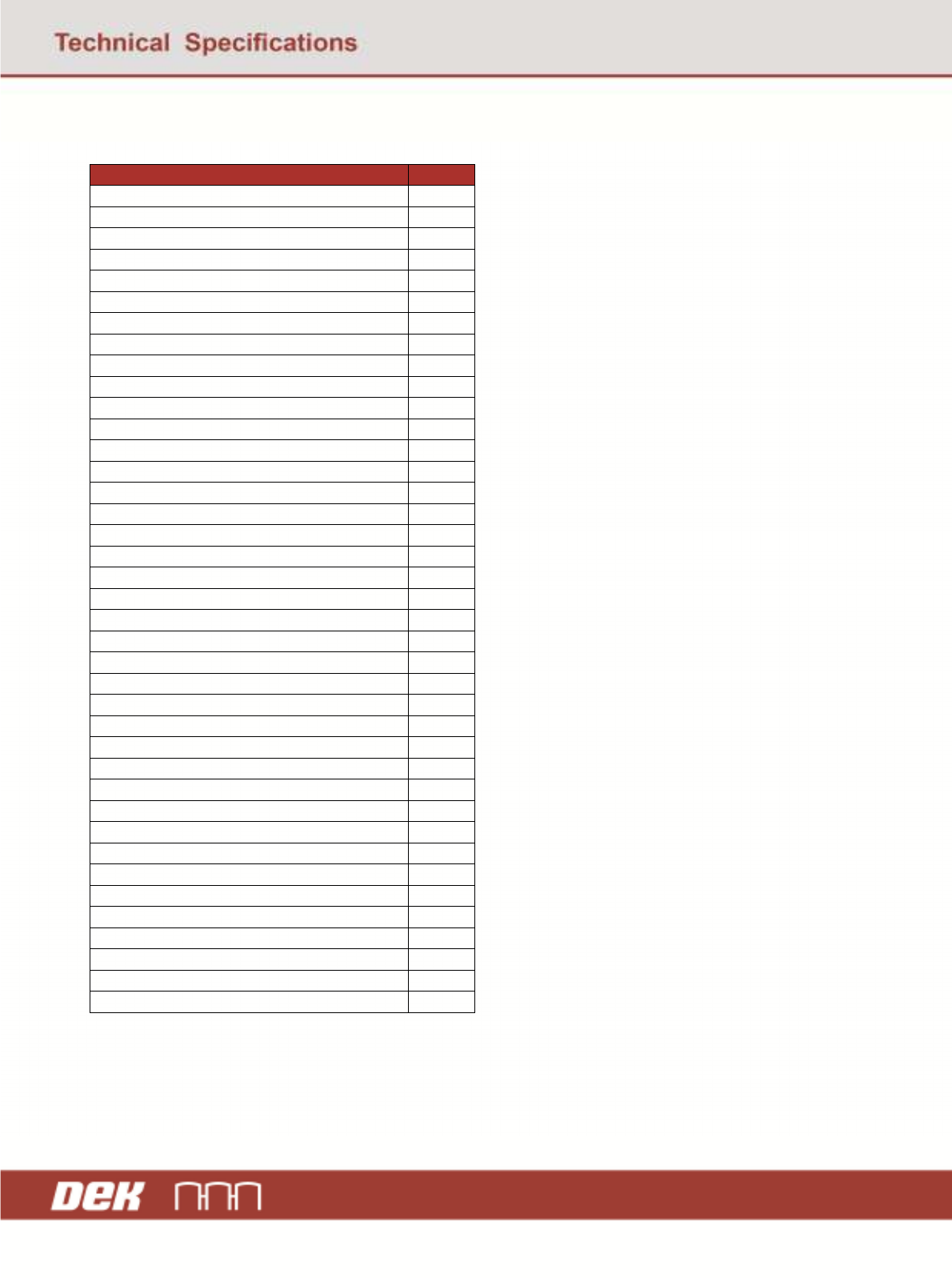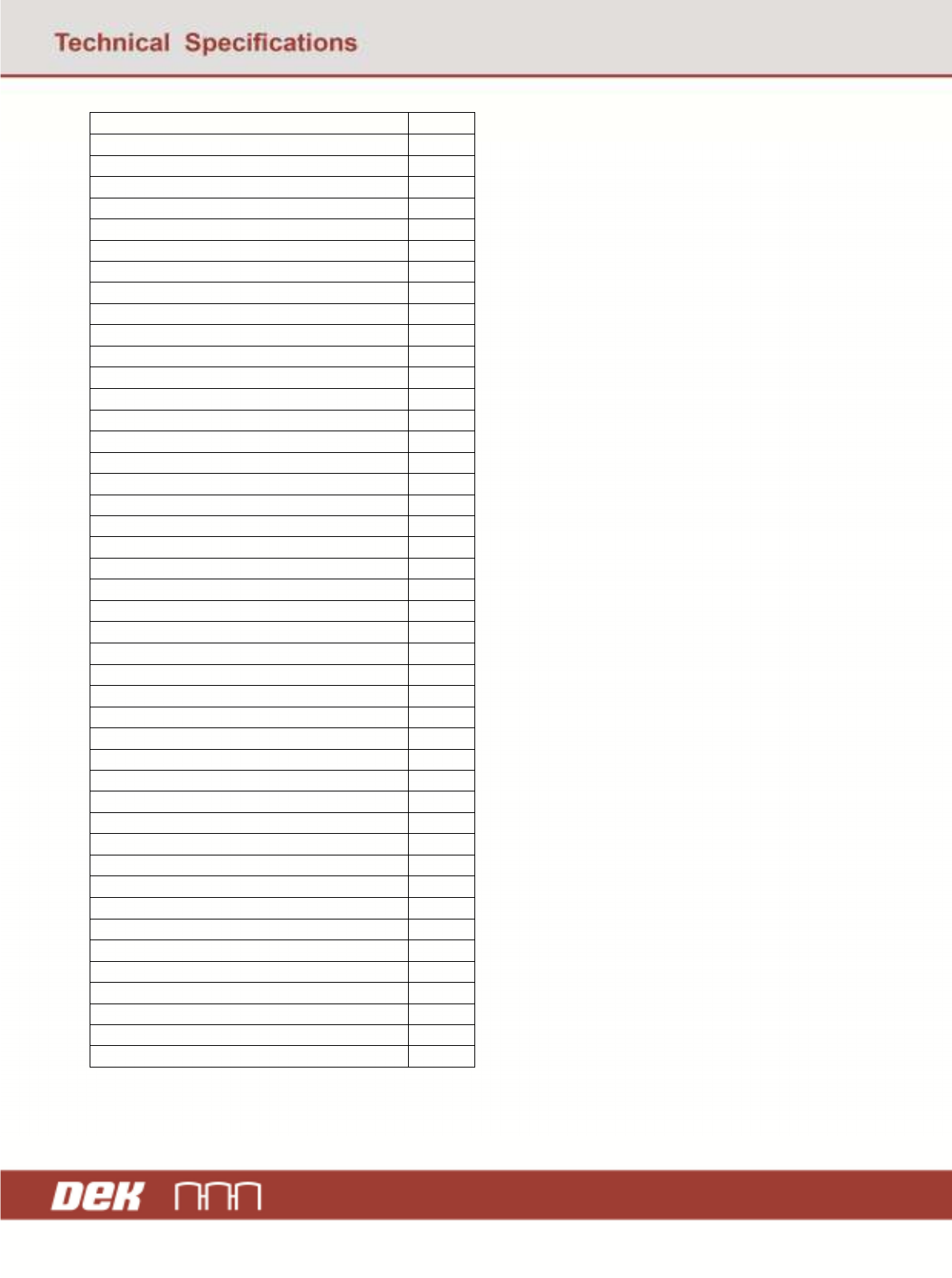 GEM Manual for DEK Printers Equipment Variables Issue 1.6 January 22, 2018 Page 133 of 171 6.7 Configuration Attributes Name OBJID PASTE DISPENSE POS. 99 VACUUM HOLD T IME 102 FRONT L TO R SPEED 107 REAR L TO R S PEED 10…