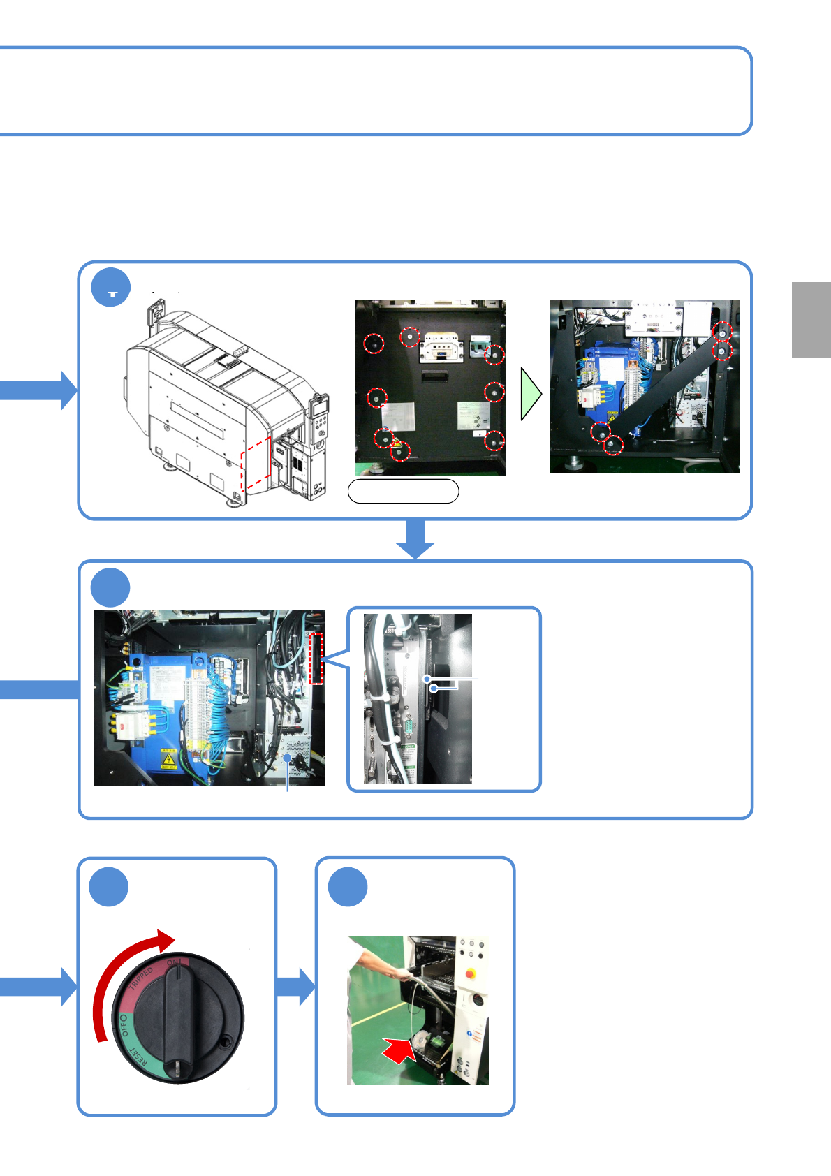 NPM-D3 EJM6DC-MB-07M-01 7-1 -1 使用工具 : 六角扳手 、吸尘器 所需时间 :10 分钟 2 安装过滤器 安装安全盖 ●螺丝 (8 个 ) 卸下交换台车 ( → P.3-2) 1 除去过滤器的灰 尘 弹簧 过滤器 过滤器的清扫 ( 主控制器 ) 维修保养篇 7-1 ●使用弹簧夹住过滤器。 ●捏住弹簧的提纽往内推入, 如照片所示使突起部 A 卡住。 4 主电源开关置于 OFF , 上锁 OFF 卸下料架工作台…