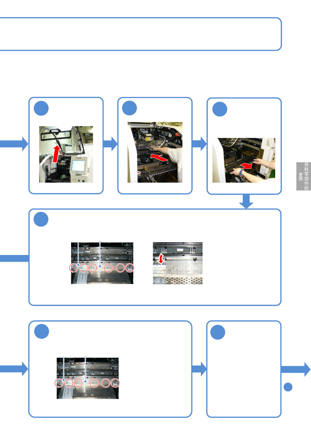 NPM-D3 EJM6DC-MB-11M-02 对在前侧操作时的基板传送带的传送 皮带的更换方法进行说明。 使用工具 : 六角扳手 (2 mm) 所需时间 :30~60 分钟 11 - 1 -3 12 13 ON 14 15 ●在每个轨道的规格下的传送皮带的 配置,记载在下一页上。在进行 皮带的更换作业时,请复制或剪 切必要的页面灵活使用。 ■关于传送皮带的配置 安装交换台车 ( → P.3-2) 解锁 安装料架工作台盖 ( → P.3…