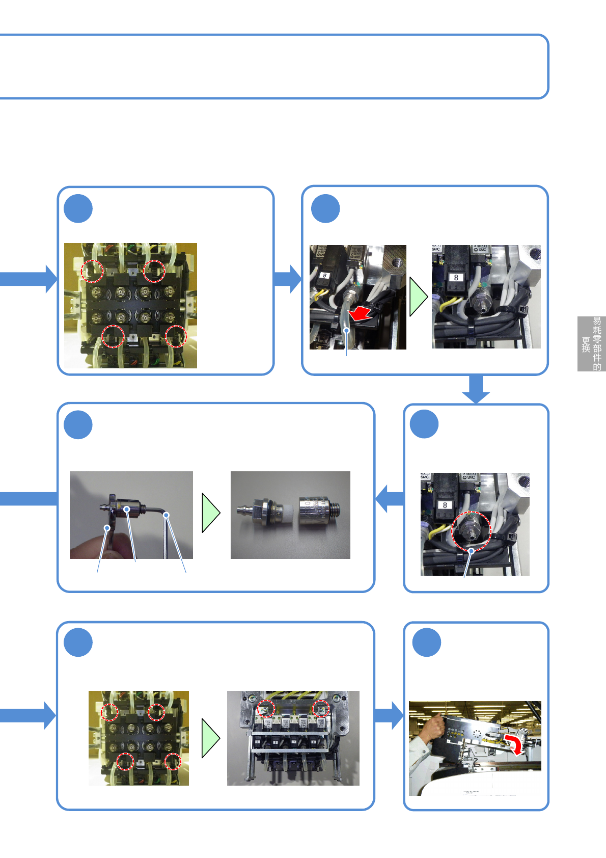NPM-D3 EJM6DC-MB-11M-02 11 - 8 -2 12 13 安装配线固定用托架的螺丝后,安装托架 ●螺丝 ( 前侧 2 个、后侧 2 个 ) 使用工具 : 六角扳手 (2.5mm) 安装贴装头后,进 行校准 ( → P.10-1) ●螺丝 ( 4 个 ) 3 4 5 卸下配线固定用托架的螺丝 使用工具 : 六角扳手 ( 2.5 mm ) ●螺丝 ( 4 个 ) 卸下软管 ● 8 处 软管 卸下过滤器 ● 8 处 使用…
