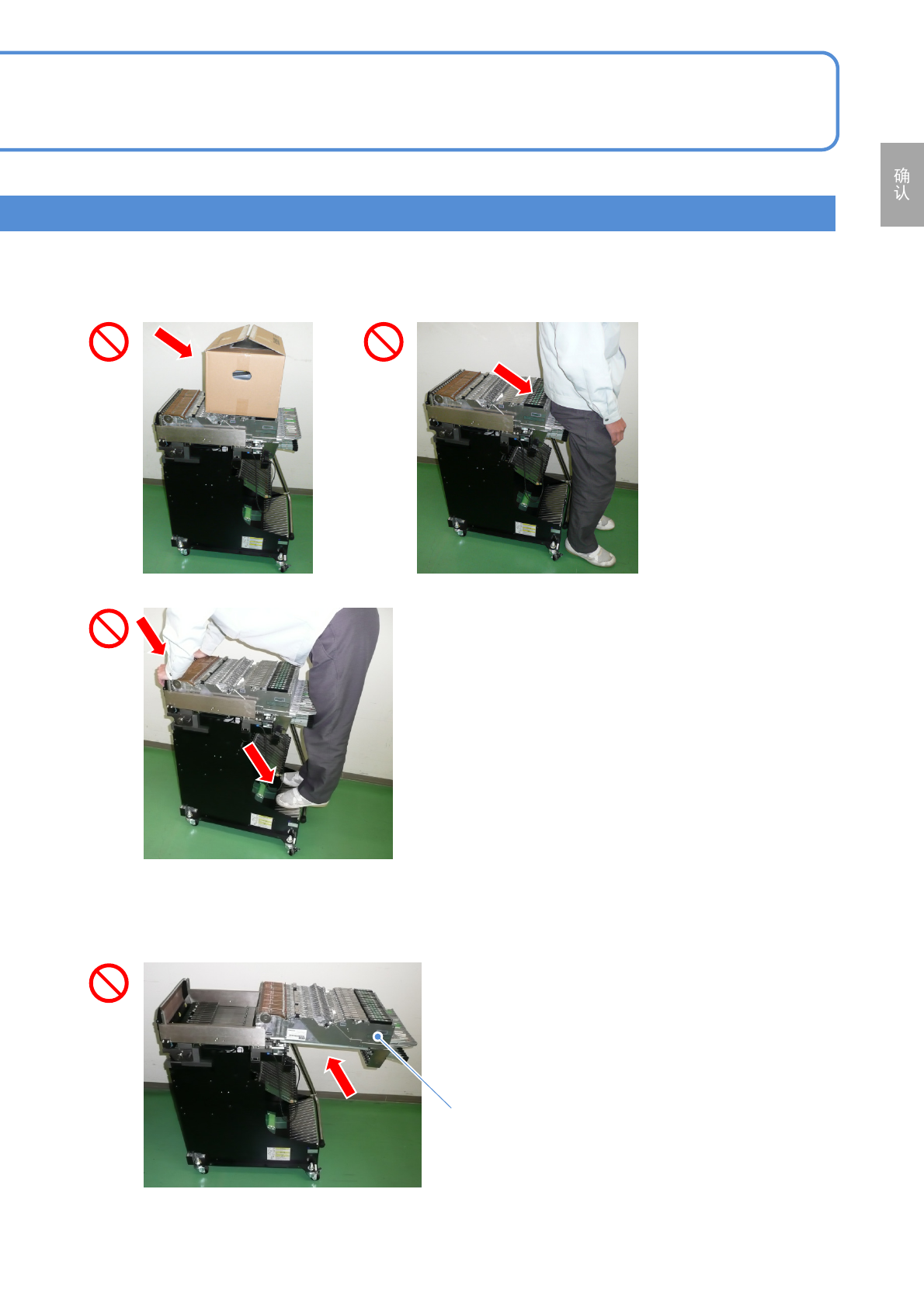 ■请不要在交换台车上放置编带料架以往的物品。另外,请不要依靠或坐到、