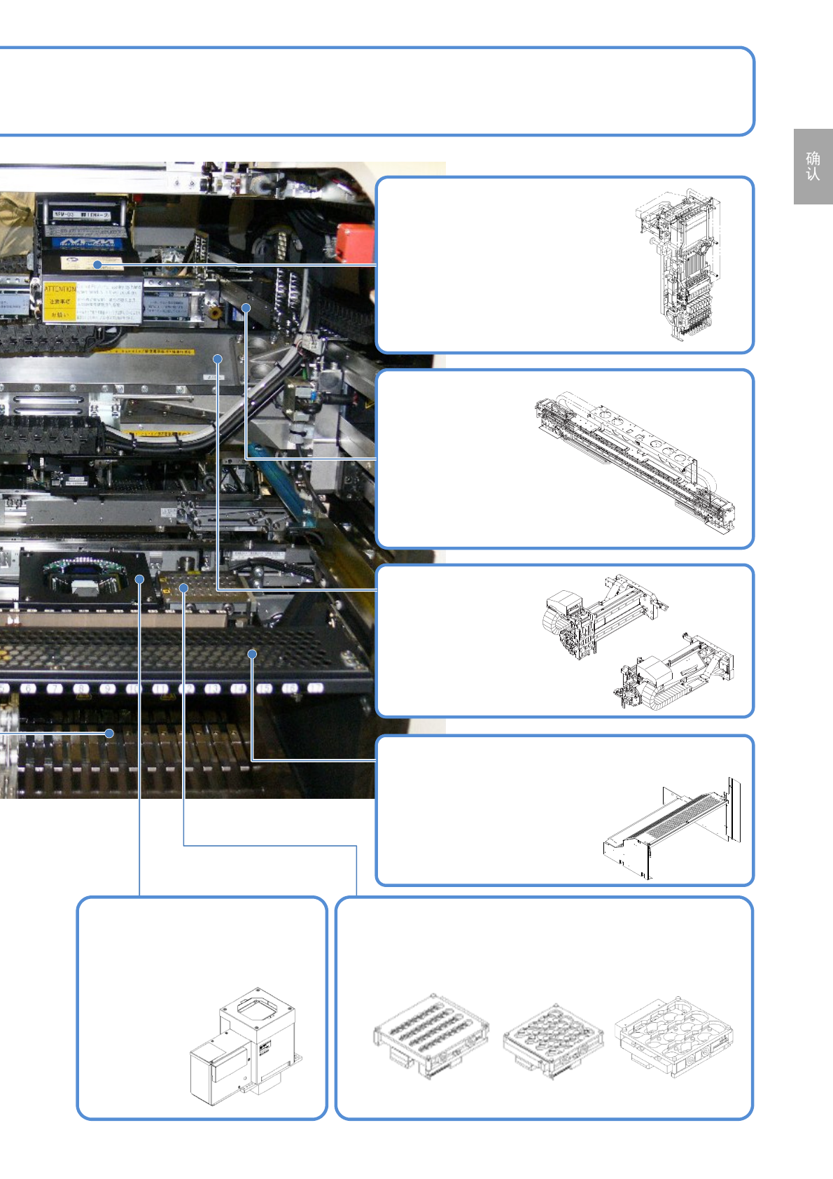 NPM-D3 EJM6DC-SF-01N-0 2 1-9-3 -2 识别元件。 多功能识别照相机 吸嘴交换器单元 收藏或更换吸嘴。 轻量 16/12 吸嘴贴装头用 8 吸嘴贴装头用 2 吸嘴贴装头用 料架工作台盖 机器启动时,确保机器主体内部 的安全。 X 轴驱动 单元 把吸嘴贴装头 往 X 方向移动。 Y 轴驱动 单元 把吸嘴贴装头 往 Y 方向移动。 贴装头 在元件的供给位置,吸嘴吸着元件, 在基板上贴装元件。 ●有轻量 16/12…