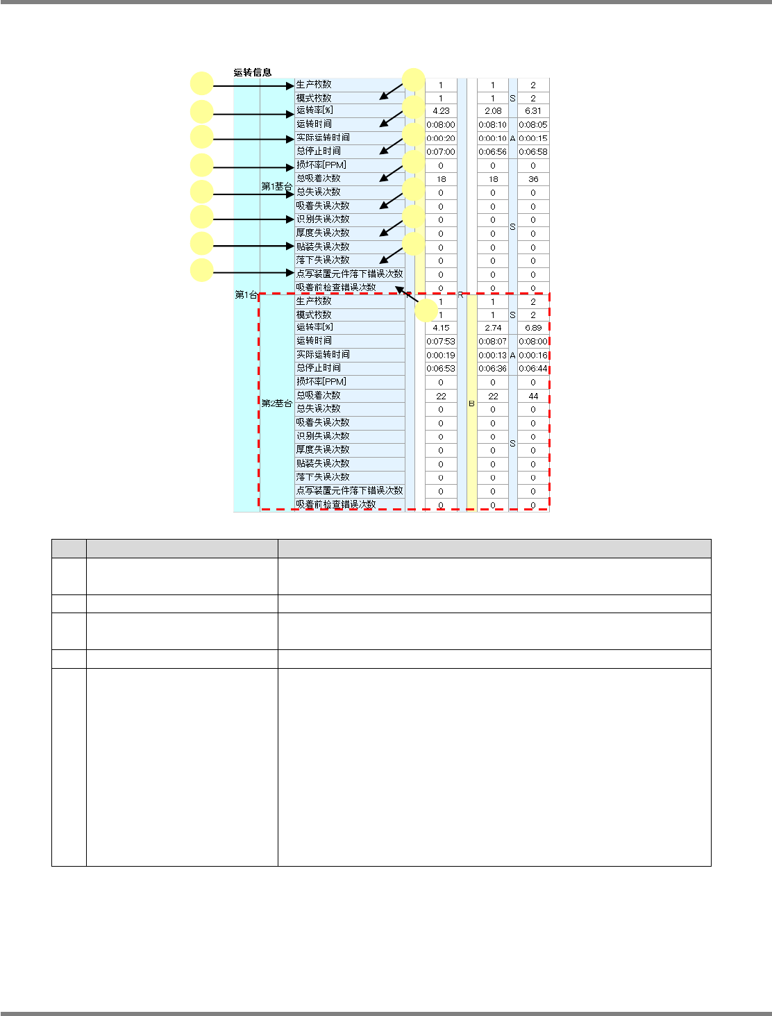 NPM X / NPM / AM / VM LNB 3.1 生产管理信息 EJM5DC-MB-03L-17 Page 3-11 名称 说明 f 总停止时间 机器在生产中停止的时间。 ( 1) g 损坏率 [PPM] 用以下的算式计算仕损率。 ( 1) 总失误次数 / 总吸着次数 1000000 h 总吸附次数 这个生产线的总吸附失误次数。 ( 1) i 总失误次数 这个生产线的总失误次数。 ( 1) 总失误次数是…