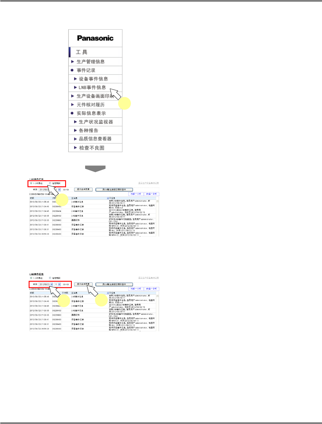 NPM X / NPM / AM / VM LNB 3.2 事件信息 Page 3-28 EJM5DC-MB-03L-17 ① 显示事件信息的变更 1 选择 ‘ 显示生产设备事件记录 ’ 。 显示出设备事件信息。 ② 显示时区的变更 可变更发生事件的时区,并显示信息 。 详细内容,请参照 “3.2.1 设备事件信息 ■ 1 小时单位的显示时间带的变更 ” 。 ③ LNB 事件项目的说明 名称 说明 a 时间 发生事件的日期和时间。 …