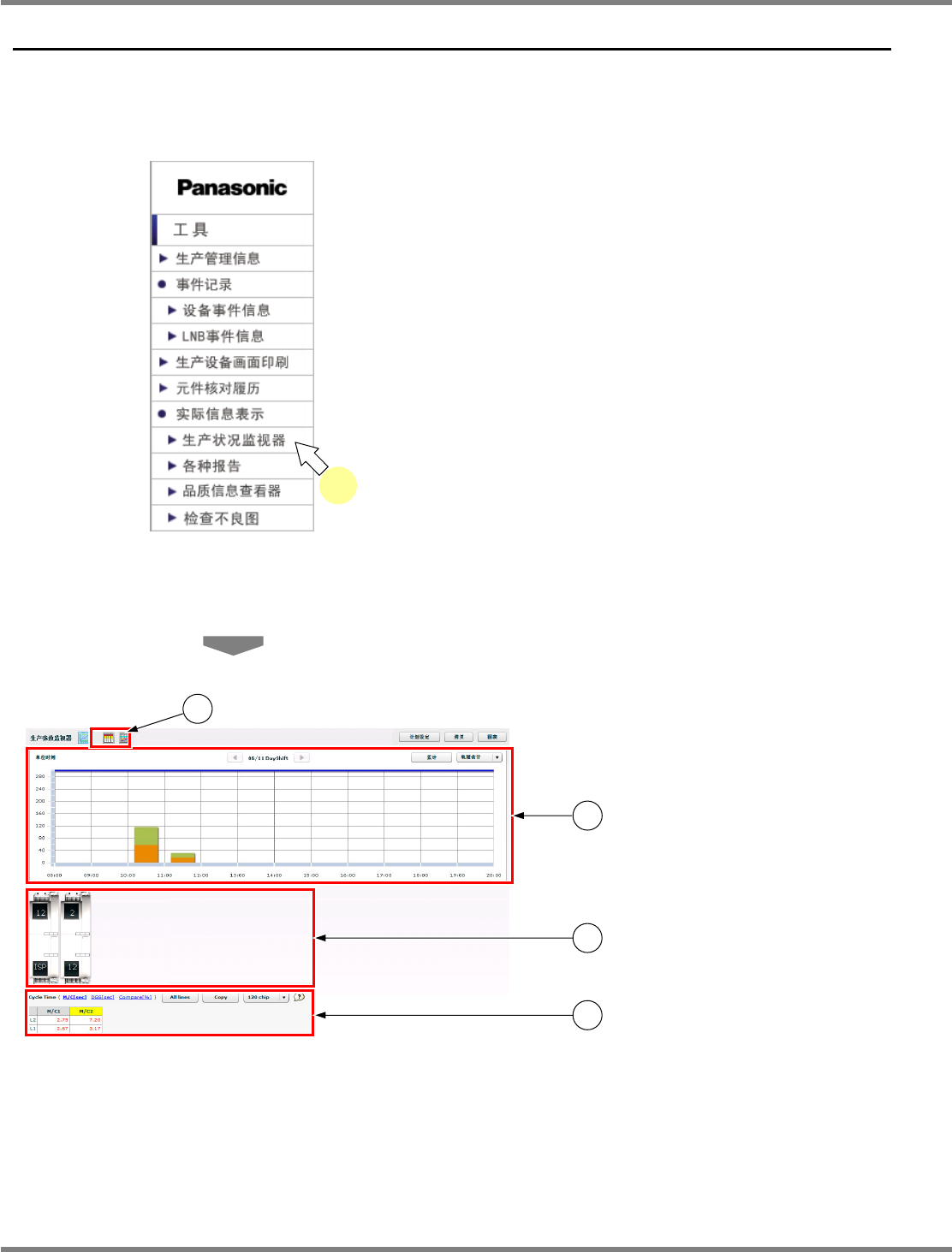 NPM X / NPM / AM / VM LNB 3.5 实际信息表示 EJM5DC-MB-03L-17 Page 3-41 1. 调度部 A) 生产张数图表 ① 生产张数图表 ( 单位时间 ) 在生产张数图表 ( 单位时间 ) 中显示下述信息。 信息 说明 切换 显示所选择的切换。 累计 显示生产张数图表 ( 累计 ) 。 轨道 显示所选择的轨道。 计划张数 显示每个单位时间的计划张数的累计 。 生产实绩 显示在每个单位时间所生产的…