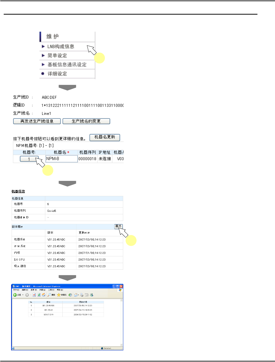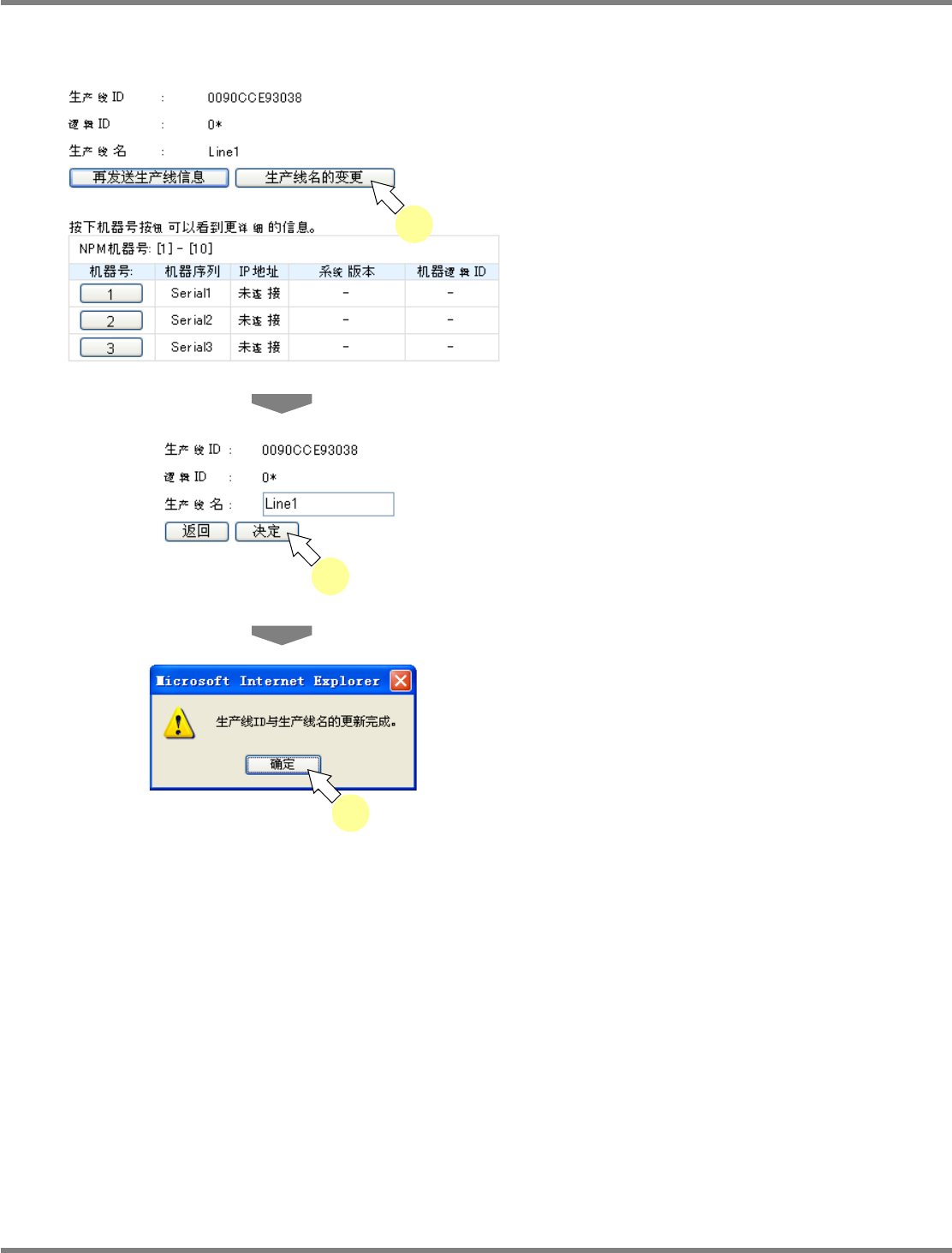 NPM X / NPM / AM / VM LNB 4.1 LNB 构成信息 EJM5DC-MB-04L-18 Page 4-3 生产线名的变更 可在 <LNB 构成信息 > 画面上进行生产线名的变更。 1 点击 <LNB 构成信息 > 画面的 [ 生产线名 的变更 ] 。 生产线名将处于可编辑的状态。 2 输入变更的信息,点击 [ 决定 ] 。 显示出更新完成的对话框,反映变更 内容。 3 点击 […