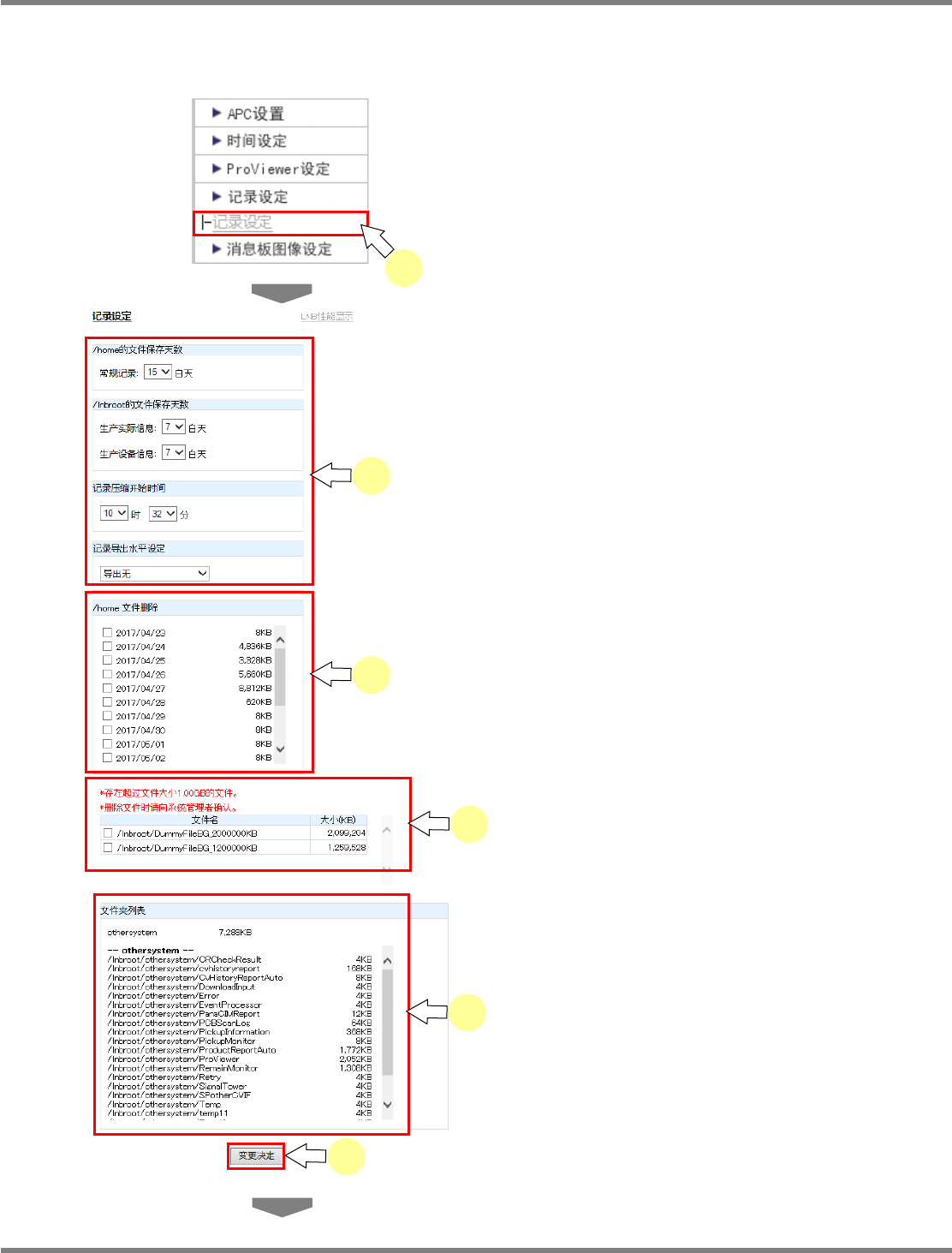 NPM X / NPM / AM / VM LNB 4.4 详细设定 Page 4-44 EJM5DC-MB-04L-18 5 在 ‘ 文件夹列表 ’ 下, 确认 ’/lnbroot/othersystem’ 中的文件 夹和文件列表。 仅用来显示。因此想要删除文件时, 请直接访 问共享文件夹后删除文件。 6 点击 [ 变更决定 ] 。 在变更了 ‘ 文件保存天数 ’ 时,将显示确认对话 框。 7 点击 [OK] 。 完成了包…