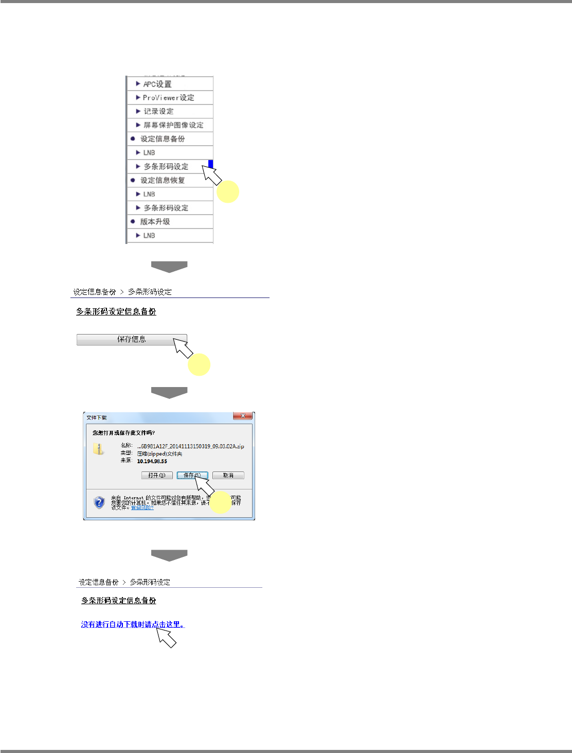 NPM X / NPM / AM / VM LNB 4.5 设定信息备份 EJM5DC-MB-04L-18 Page 4-49 4.5.3 多条形码设定 进行多条形码的设定信息备份操作。 针对在这里备份的设定信息,可通过 ‘ 设定信息恢复 ’ 的 ‘ 多条形码设定 ’ 读取。 1 从菜单中选择 ‘ 设定信息备份 ’ 的 ‘ 多 条形码设定 ’ 。 显示出 < 多条形码设定信息备份 > 画面。 2 点击 [ 保存信息 ] …