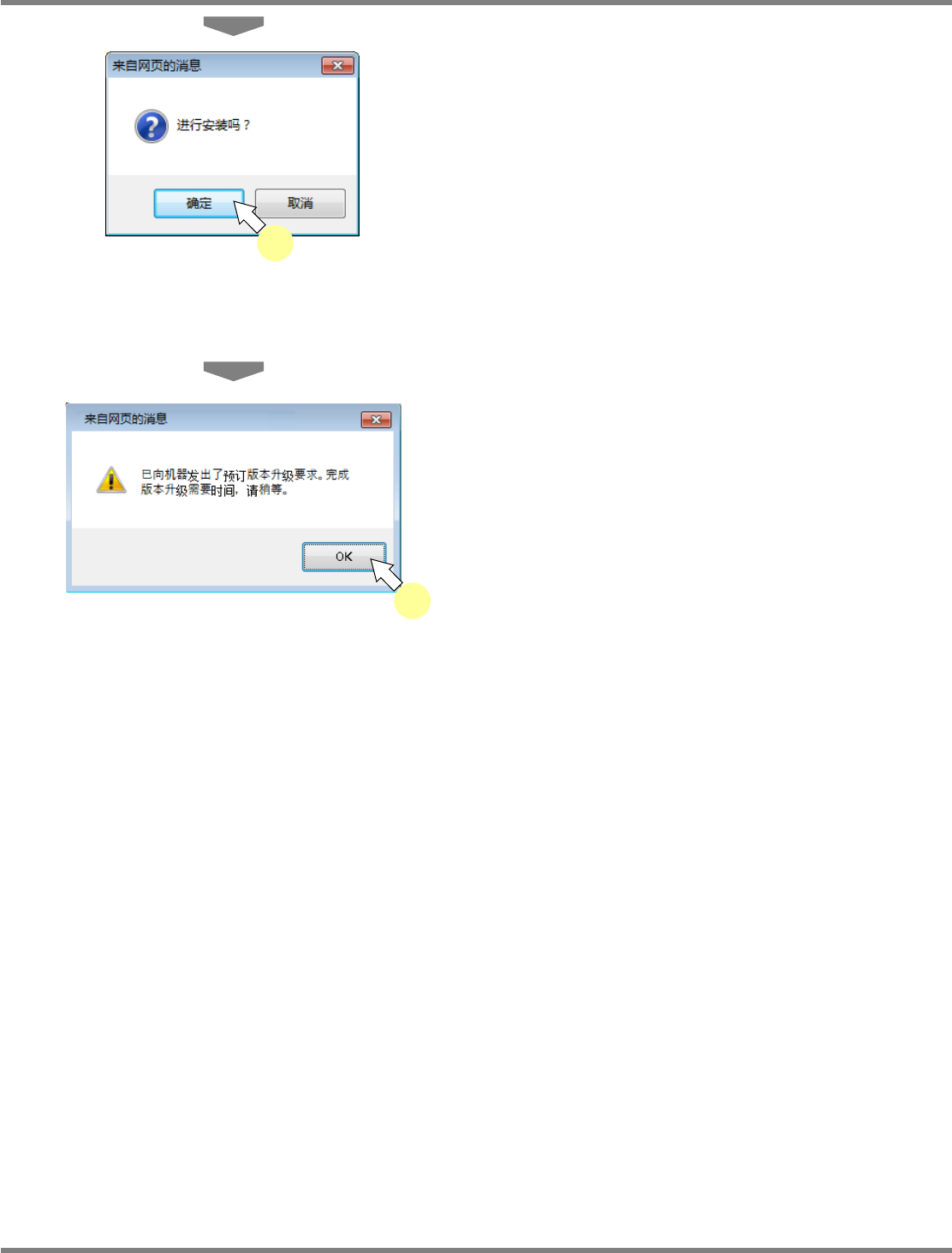 NPM X / NPM / AM / VM LNB 4.7 版本升级 Page 4-58 EJM5DC-MB-04L-18 10 点击 [ 确定 ] 。 将显示来自网页的信息。 向设备发出的预定版本升级要求成功 时,将会 发出这个信息。 从打头设备开始当基板用完时,自动 停止设备 后开始版本升级。 在第 2 台之后,将按照顺序在基板用 完后开始 版本升级,因此请确认好设 备 ( 不会发生跳过顺 序的情形 ) 。 完成了版本升级的设备…