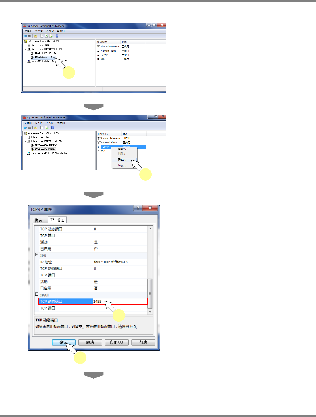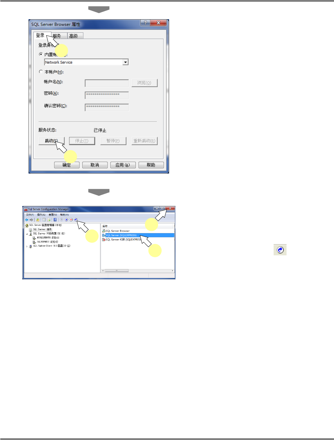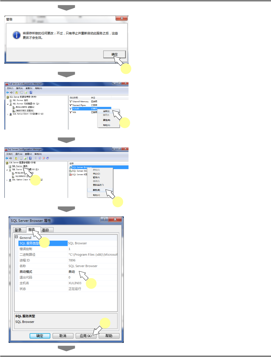 NPM X / NPM / AM / VM LNB 2.7 品质信息数据库的安装 Page 2-58 EJM5DC-MB-02L-16 4 点击 [ 确定 ] 。 5 在 ‘TCP/IP’ 上右击后,点击 [ 启用 ] 。 T CP/IP 将转为有效。 6 选择 ‘SQL Server 服务 ’ 。 7 在 ‘SQL Server Brower’ 上右击后, 点击 [ 属性 ] 。 8 点击 [ 服务 ] 标签。 9 在 ‘ 启动模…