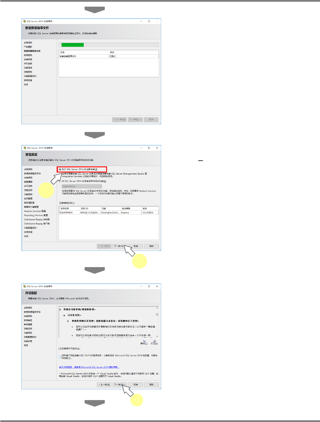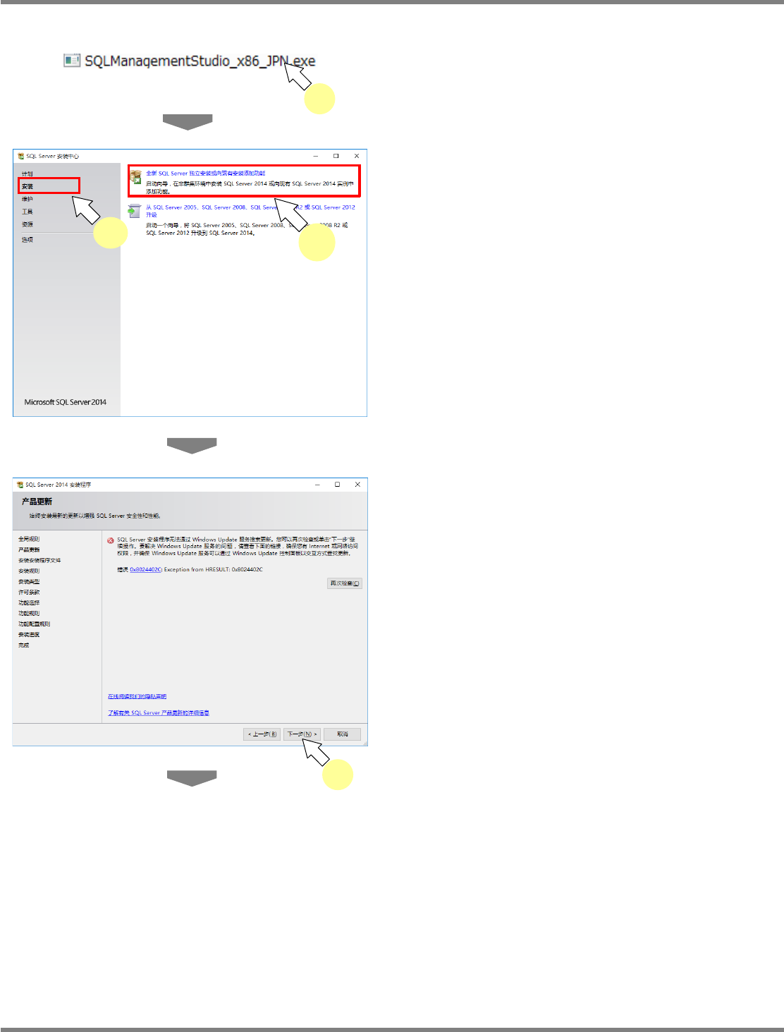 NPM X / NPM / AM / VM LNB 2.7 品质信息数据库的安装 Page 2-64 EJM5DC-MB-02L-16 2. SQL Server Management Studio Express 的安装 1 启动 ‘SQL Server Management Studio Express’ 的安装程序。 2 点击菜单的 [ 安装 ] 的 [ 全新 SQL Server 独立安装或向现有安装添加功 能 ] 。 3 点击…