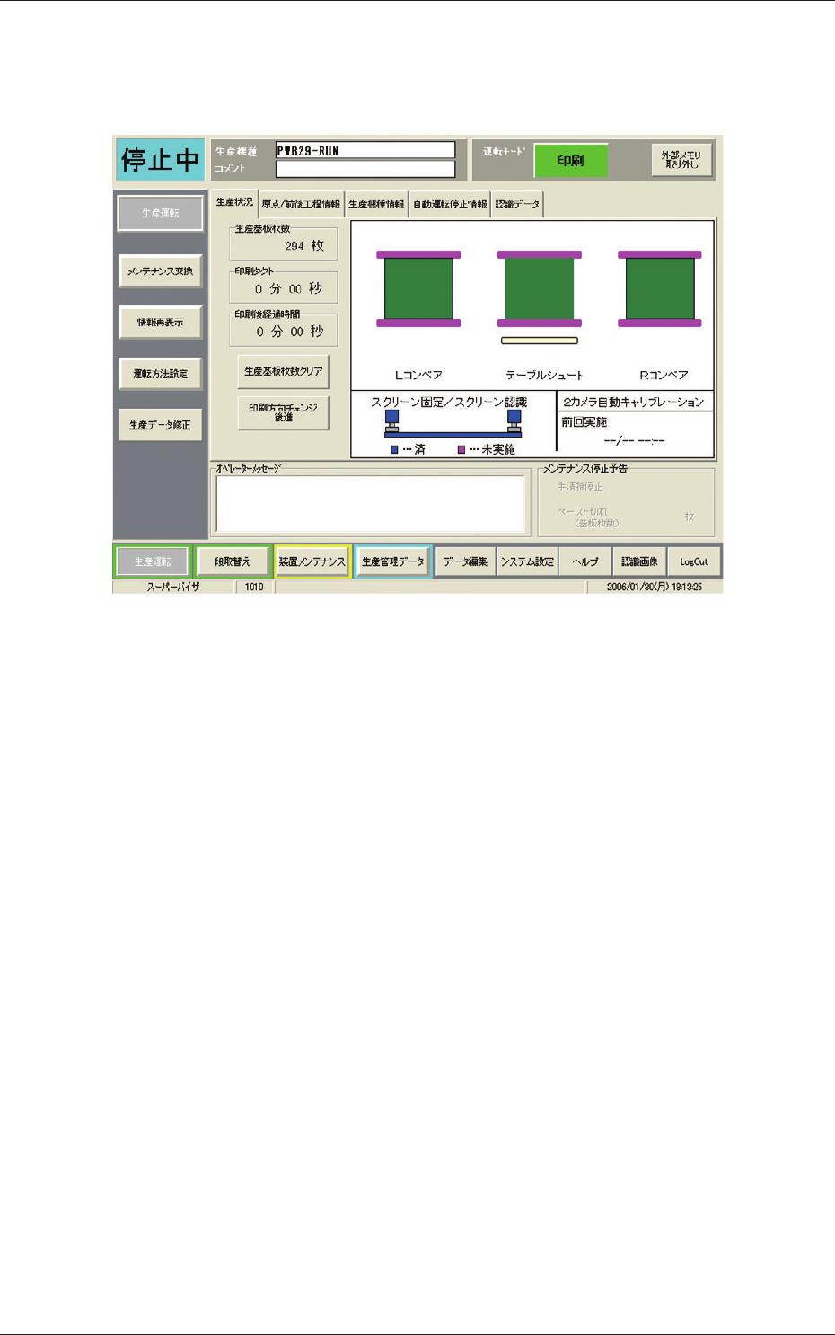 タッチスクリーンにメインメニューバーおよび生産運転メ