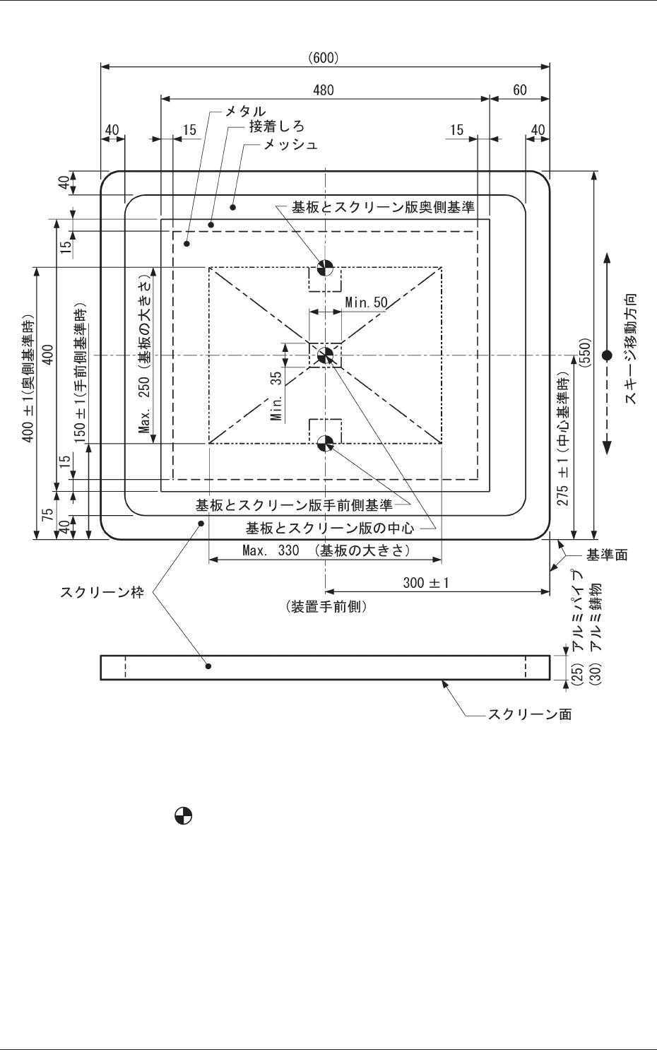 5-15 Tg1297-ID-GU 1.3 印刷スクリーン製版仕様 1.3 印刷スクリーン製版仕様 (1) スクリーン枠の大きさ 550 × 550 mm の場合 単位:mm Fig. 1E1 注 : (a) 2 点鎖線は、基板の外形を示します。 (b) 印に位置するようにパターンを焼き付けてください。 (c) メッシュ仕様では、全面がメッシュとなります。 メタルコンビ仕様では、 “400 × 400 mm”のメタルを Fig. 1E1…
