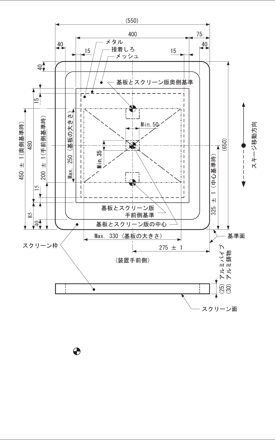 5-18 Tg1297-ID-GU (4) スクリーン枠の大きさ 550 × 650 mm の場合 ( 縦長 ) 単位:mm Fig. 1E4 注 : (a) 2 点鎖線は、基板の外形を示します。 (b) 印に位置するようにパターンを焼き付けてください。 (c) メッシュ仕様では、全面がメッシュとなります。 メタルコンビ仕様では、 “400 × 480 mm”のメタルを Fig. 1E4 の位置としてください。 (d) スクリーン版中心…