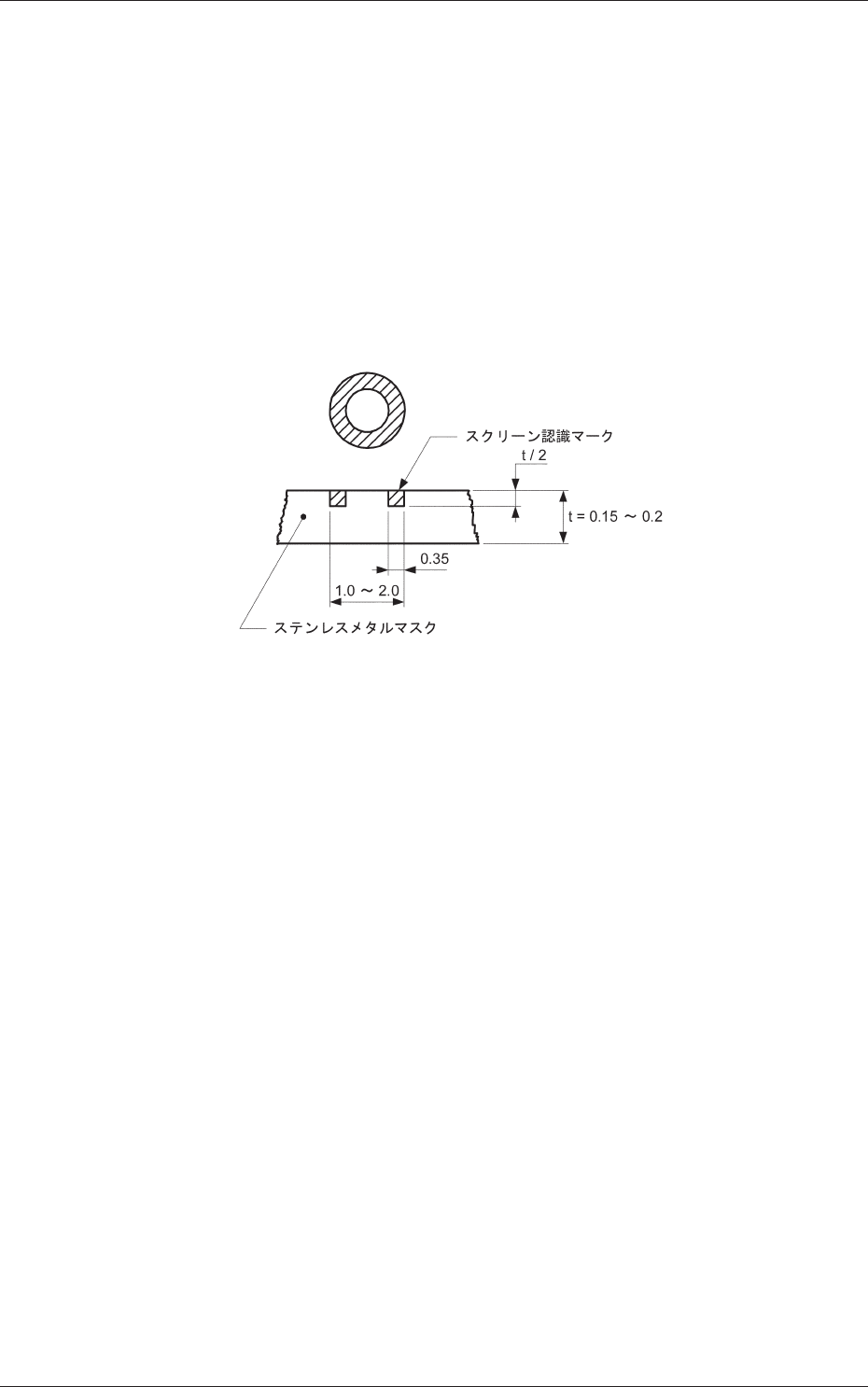 5-19 Tg1297-ID-GU 1.3 印刷スクリーン製版仕様 (5) スクリーン版材質とスクリーン認識マークの設定 (5.1) スクリーン版の材質 • ステンレス製のメタルマスクまたはフルアディティブ Ni 製のメタルマスクを推奨します。 • Cu-Ni のメタルマスクは、表面の光沢が強いために認識 が不安定にな りますので、 マスク表面をつ や消し処理 ( ス クリーン認識マークを中心として 10 × 10 mm の範囲 ) し…