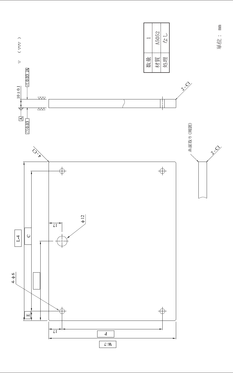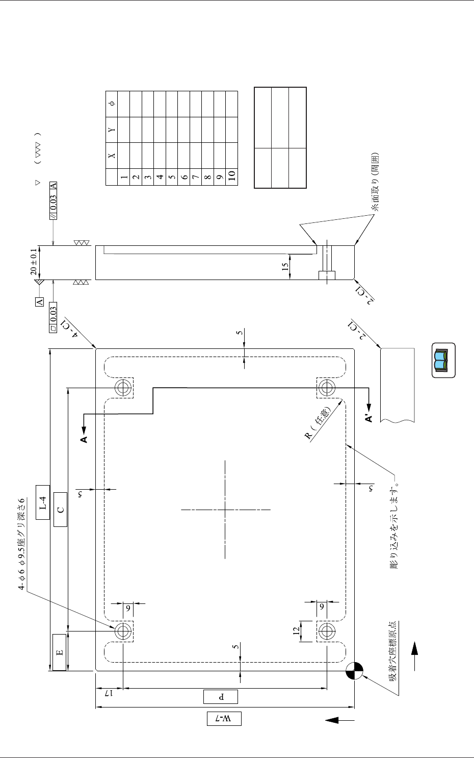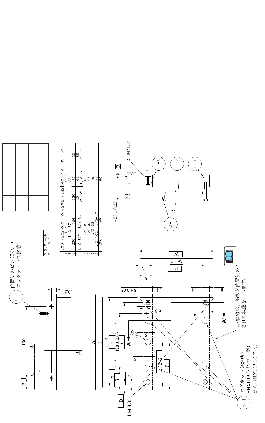 6-12 Tg1297-ID-GU 1.3 基板バックアップ吸着治具 ( 基板幅 W “65<=W<=250”) 1.3.2 プレート ( 品番 12-1) のバリアント図 数量 1 材質 処理 A5052 なし A-A'断面図 単位: mm 基板形状にしたがって適宜吸着穴をあけてください。 ノート 0607-001 -(M748-ZI-1201)