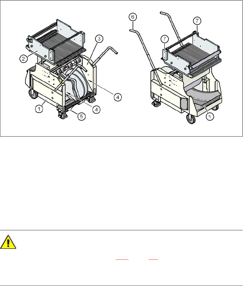 用户手册 SIPLACE SX4/DX4 3 技术数据和组件 SC.704.xx 以上软件版本 2011 年 2 月 中文版 3.10 SIPLACE SX4 上的料车 171 3.10.1 结构 料车主要由机箱、用于固定供料 器组件的转换料台、料带容 器和废料带容器组成。 3 图 3.10 - 3 料车, SIPLACE X 系列,前视图和后视图 (1) 机箱 (2) 转换料台 (3) 料带容器 (4) 符合安装列表要求的间隙 (5)…