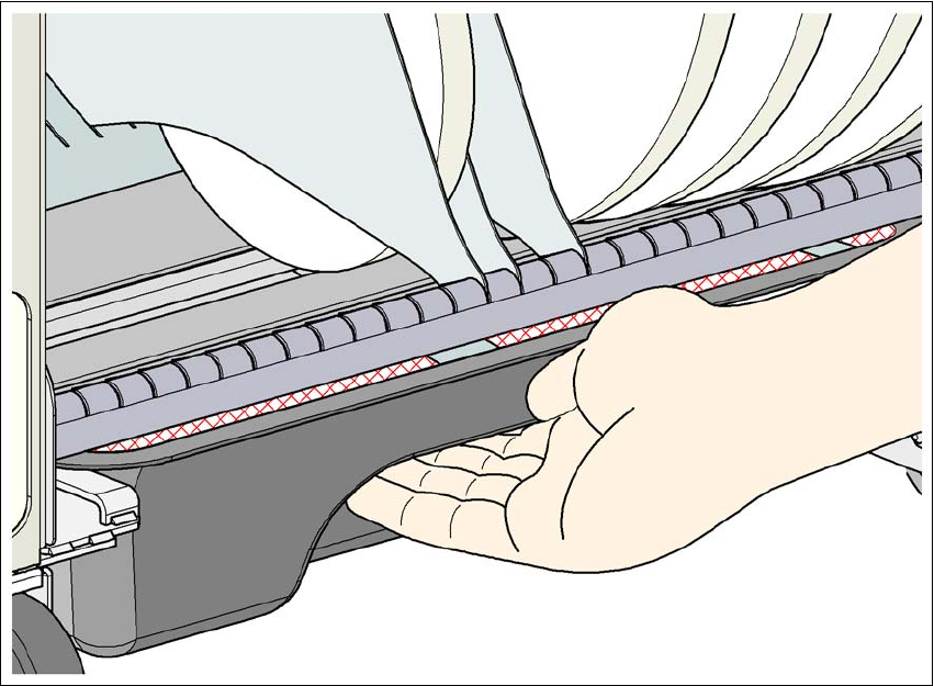 Æ 为避免此危险,用手指拿住废料带容器上凹进处的下侧并将拇指放在凹进处的顶部。