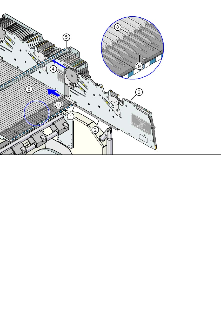 Æ 小心地推动供料器组件,直到两个 " 前 " 对中销(图 5.10 - 3 中的 4,第 266 页)完全进入对中