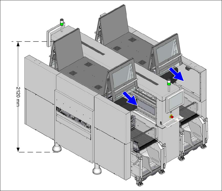 3 技术数据和组件 用户手册 SIPLACE SX4/DX4 3.3 尺寸和重量 SC.704.xx 以上软件版本 2011 年 2 月 中文版 104 3.3.3 保护罩向上折起高度 3 图 3.3 - 3 保护罩向上折起高度 - 尺寸以毫米为单位 (示例为 SX4 ) 规定的尺寸指的是最大的 PCB 传送导轨高 度 950 mm 。 (1) 随着设定的 PCB 传送导轨高度不同,此高度 值也会有所不同 - 对于 900 mm PCB…
