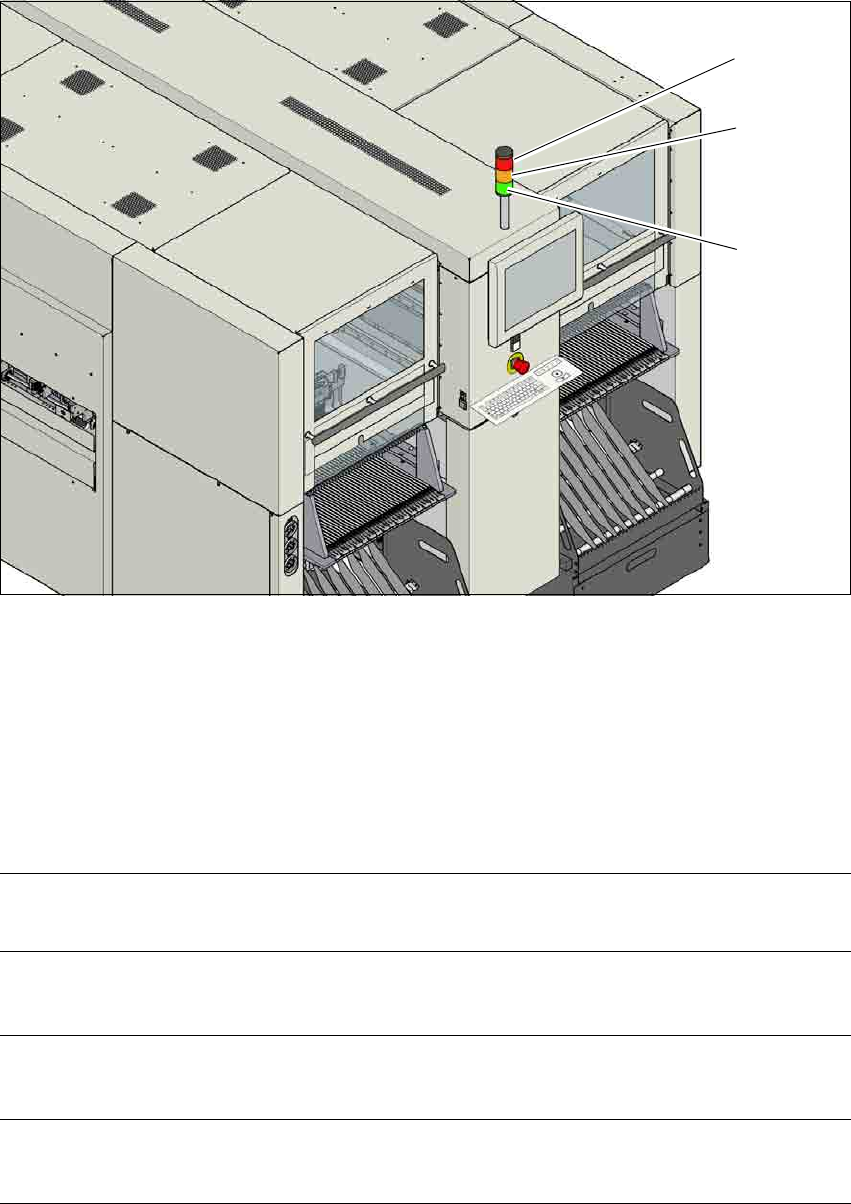 用户手册 SIPLACE SX4/DX4 5 使用贴片机 SC.704.xx 以上软件版本 版本 02/2011 EN 5.7 指示灯 253 需要由操作员这些基准点操 作。 两侧 白色:关 绿色: 100 - 100 红色:关 黄色: 500-500 绿色:关 贴片机等待方法,或收到方法 后等待贴片机准备就绪。 两侧 白色:关 绿色: 100 - 100 红色:关 黄色:关 绿色: 500 - 500 贴片机正在准备进行生产 (检 查…