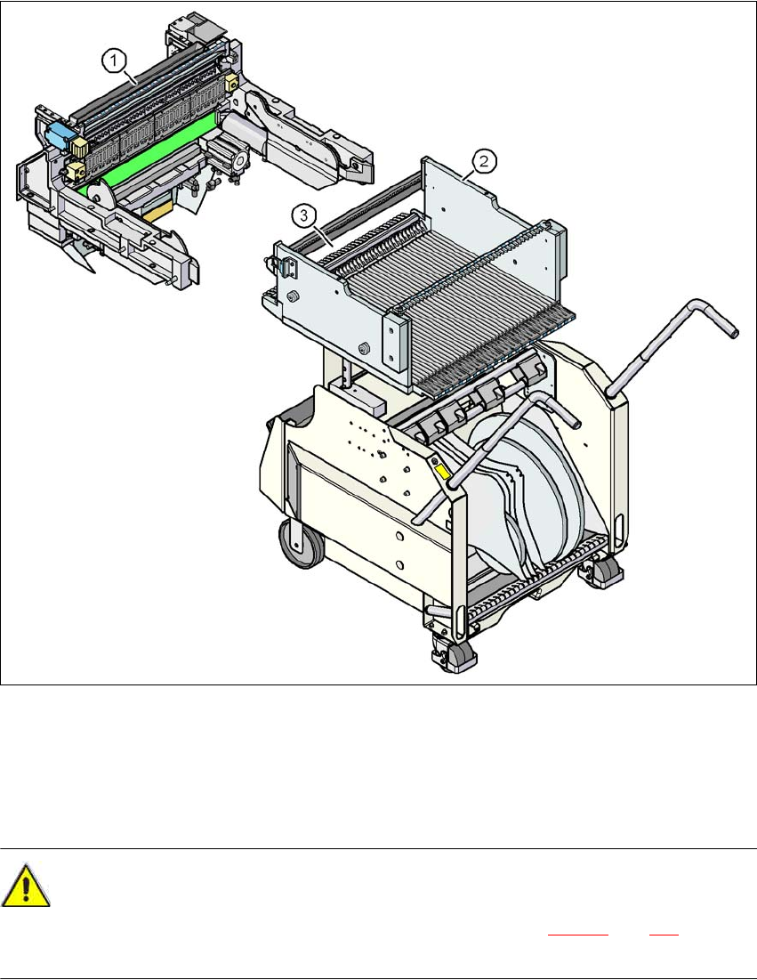 5 使用贴片机 用户手册 SIPLACE SX4/DX4 5.15 装载或卸载料车 (仅限 SX4 ) SC.704.xx 以上软件版本 版本 0 2/2011 EN 284 5.15.4 装载料车 5 图 5.15 - 3 料车和料车装卸装置, SIPLACE X 系列 (1) 料车装卸装置, SIPLACE X 系列 (2) 料车, SIPLACE X 系列 (3) 锁定插销 小心 5 将 SIPLACE X 系列的料车推入贴片机时…